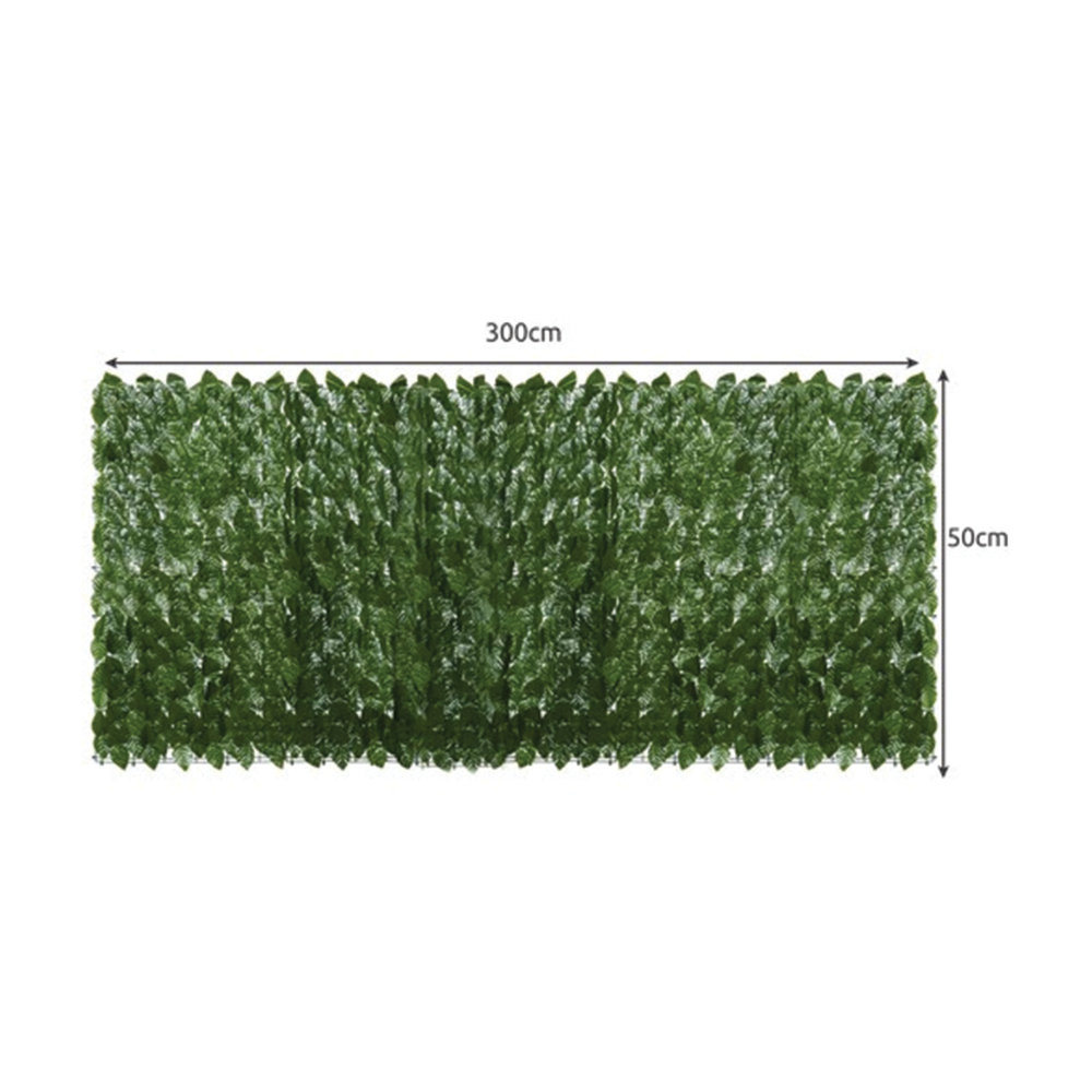 Balkónová zástěna s realistickými tmavě zelenými listy břečťanu o rozměrech 300 × 50 cm je praktickým a dekorativním řešením pro vytvoření soukromí na balkoně, terase i zahradě. Skládá se ze šesti panelů, které lze libovolně kombinovat podle potřeby. Je odolná vůči povětrnostním vlivům, nevyžaduje údržbu a zachovává si krásný vzhled po dlouhou dobu.