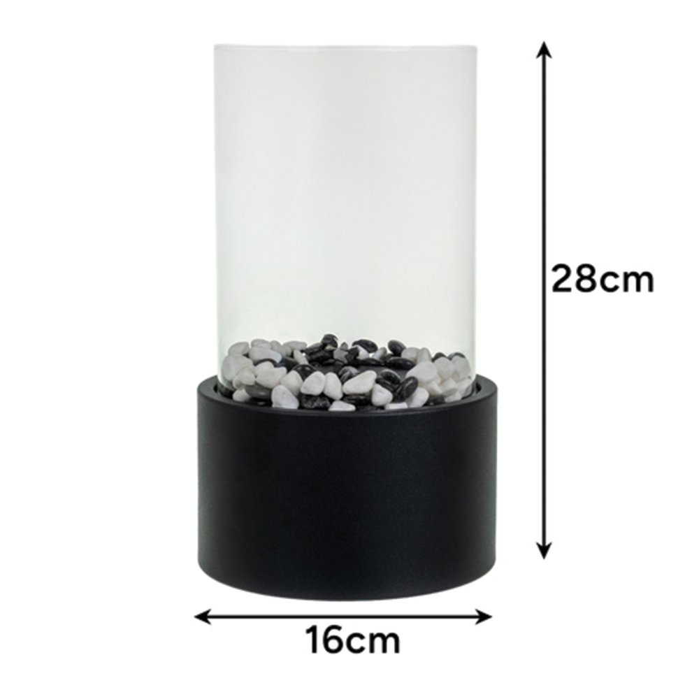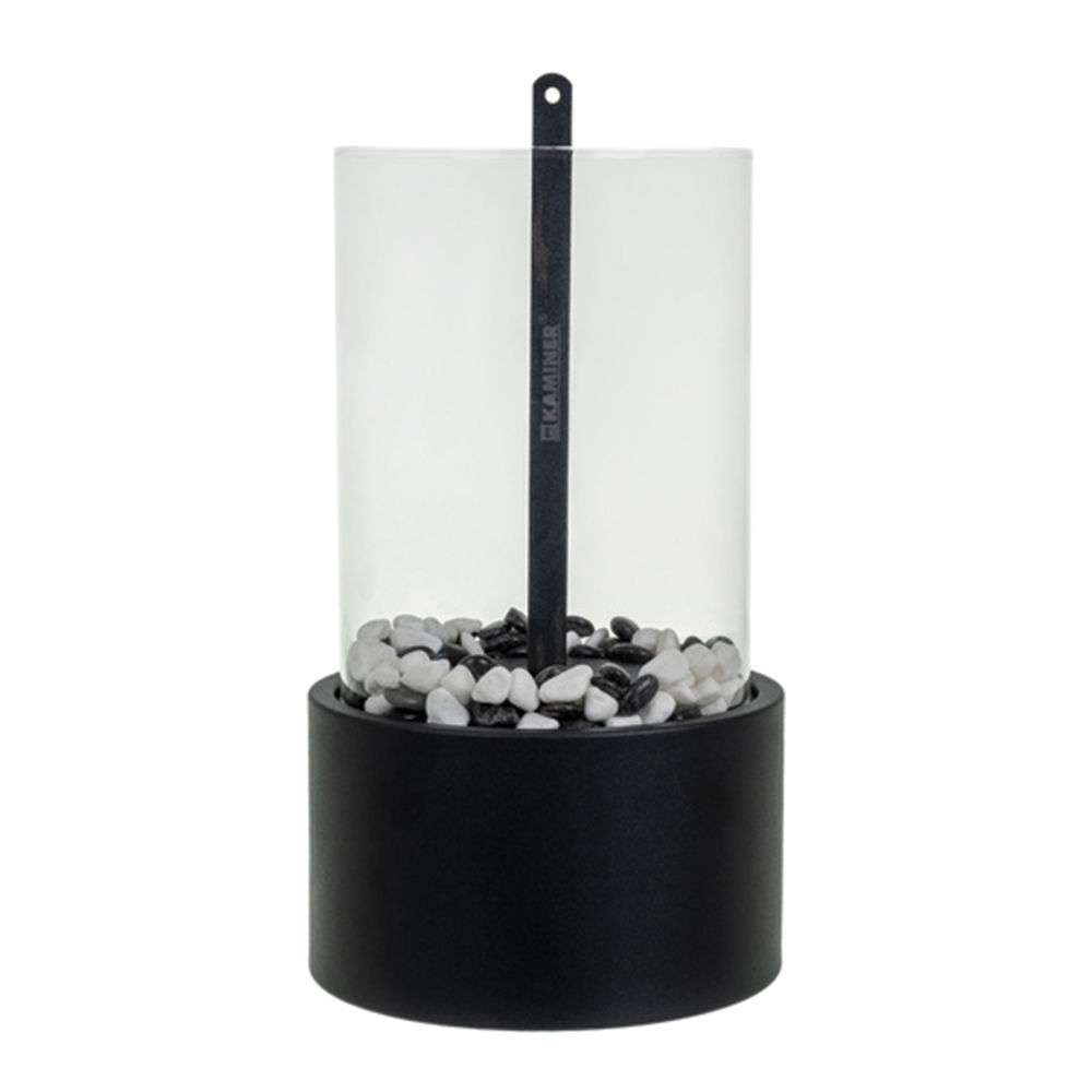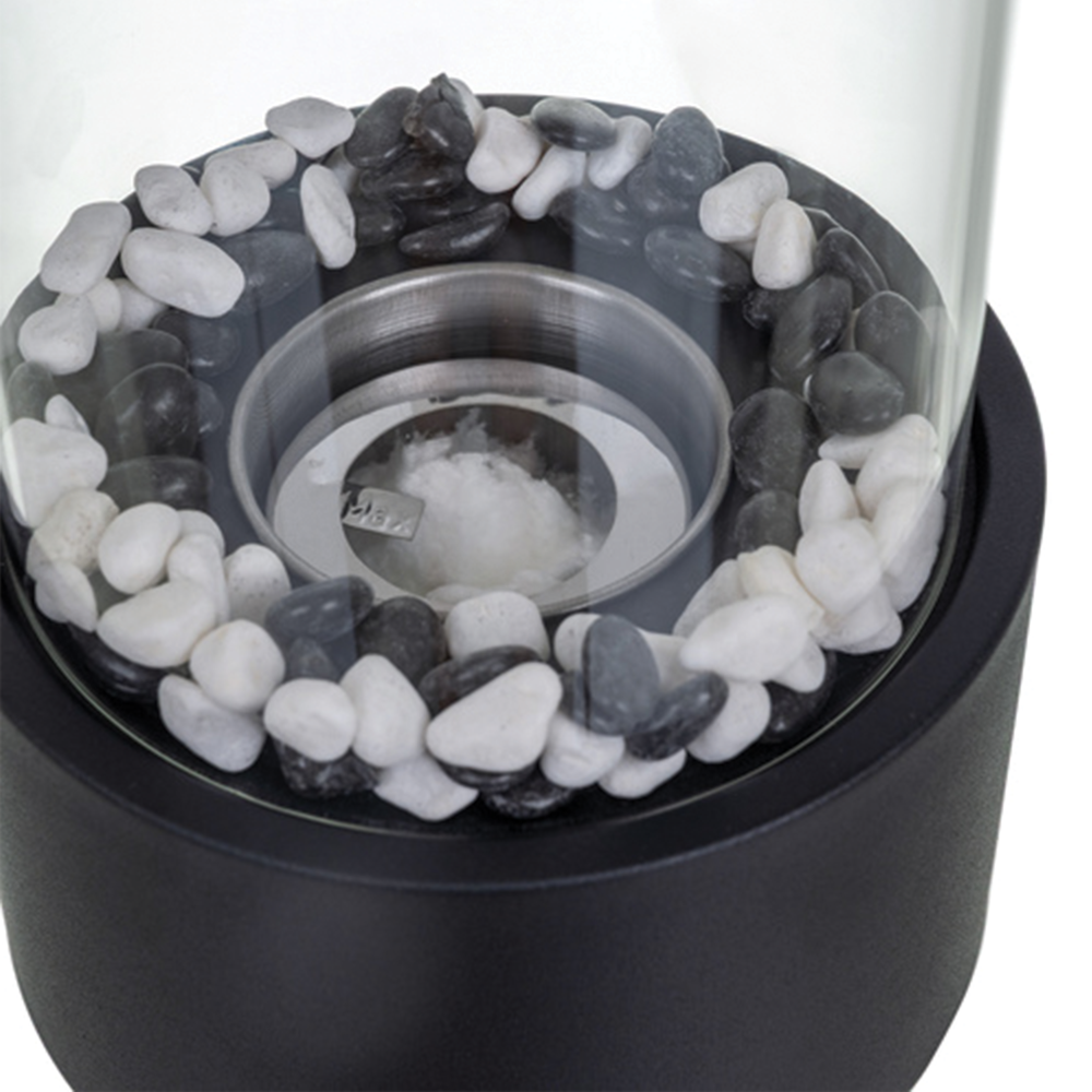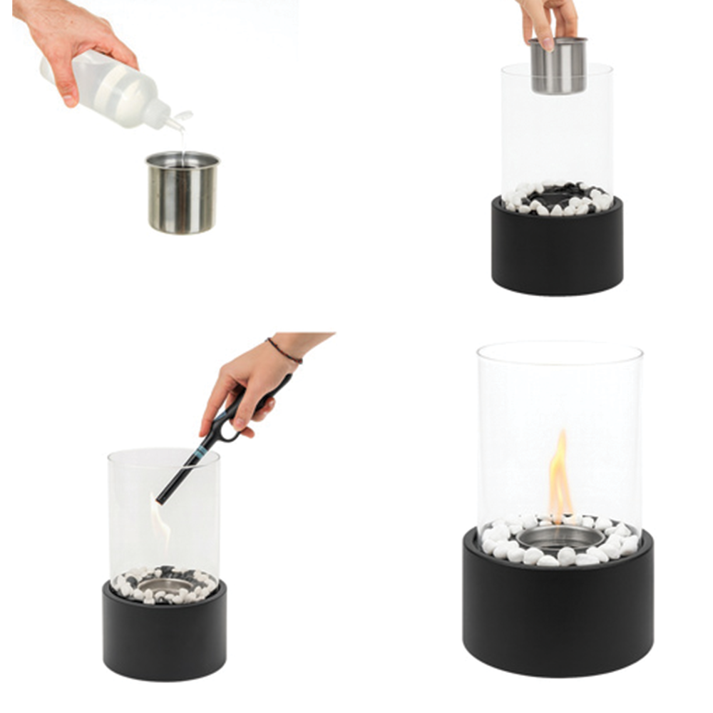 Bezpečnost a stabilita: Plamen je chráněn stěnami z nehořlavého skla, které zajišťují stabilitu ohně i při mírném průvanu a zároveň tvoří bezpečnostní bariéru proti náhodnému dotyku.