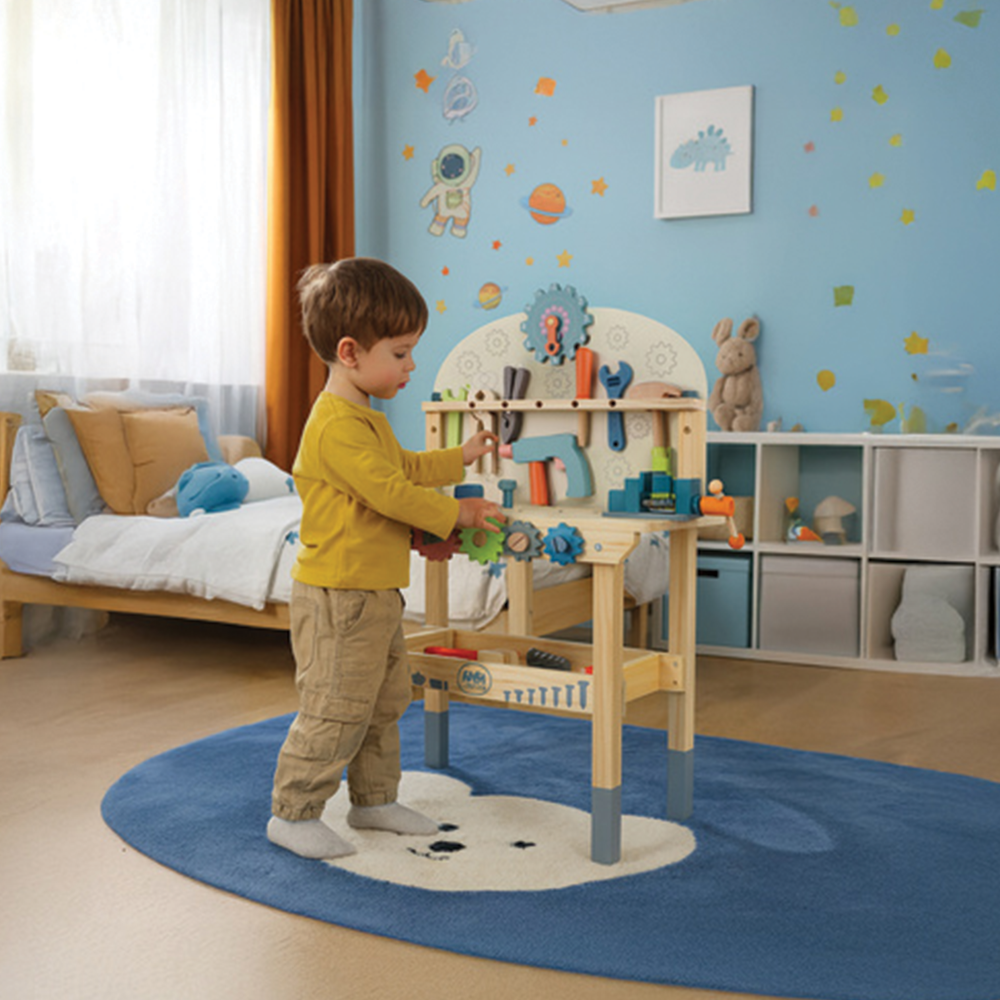 Bezpečné a přírodní materiály: Dílna je vyrobena z netoxických surovin se zaoblenými hranami, což zaručuje maximální bezpečnost a klid rodičů během každodenního hraní.
