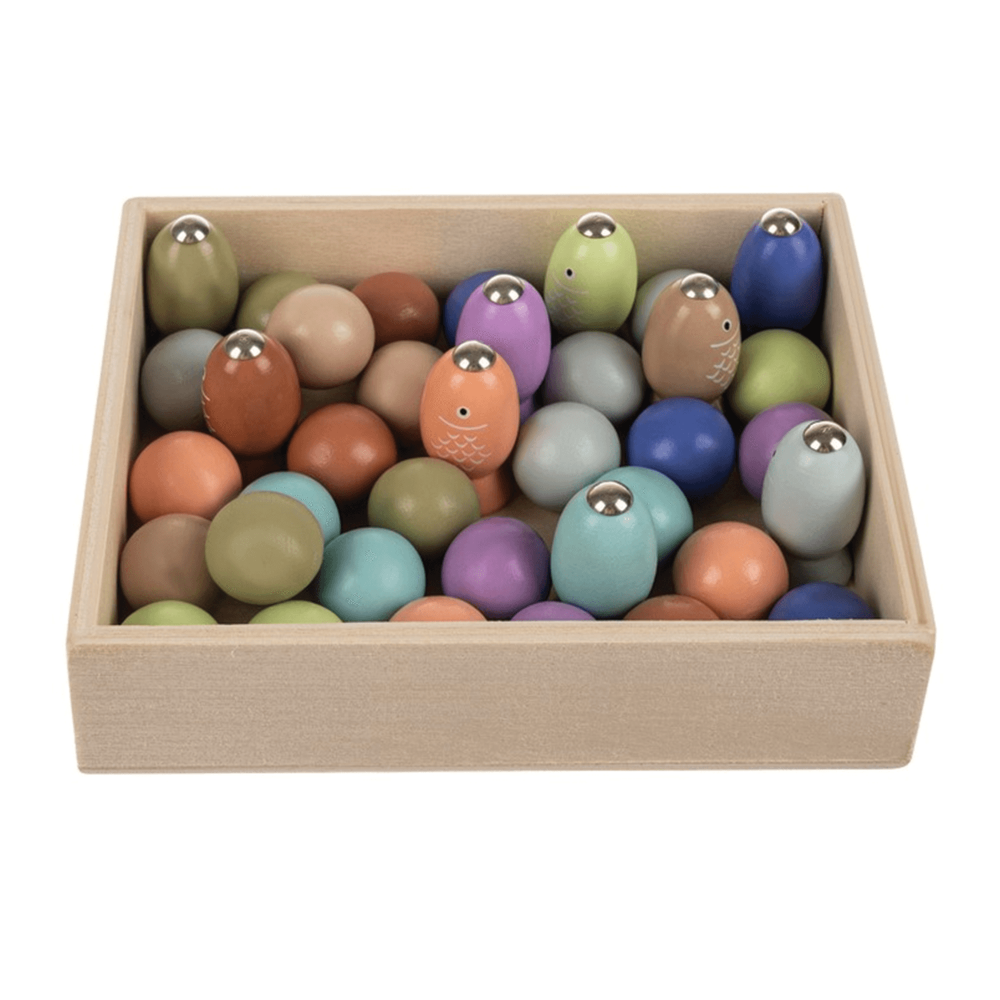 Dětská dřevěná hra - Chytání rybiček na magnet je skvělou vzdělávací a zábavnou pomůckou pro malé děti. Je vyrobena z pevného dřeva, které je odolné proti poškození a vhodné pro každodenní hraní. Děti pomocí magnetického prutu chytají barevné rybičky a třídí míčky do organizéru, čímž si rozvíjejí jemnou motoriku, koordinaci rukou a očí i schopnost soustředění. Hra podporuje logické myšlení, trpělivost a vizuální paměť. Díky pestrým barvám je pro děti velmi atraktivní a přirozeně je motivuje ke hře. Součástí balení je mnoho prvků, které umožňují různé herní varianty a udržují dítě dlouhodobě zabavené.