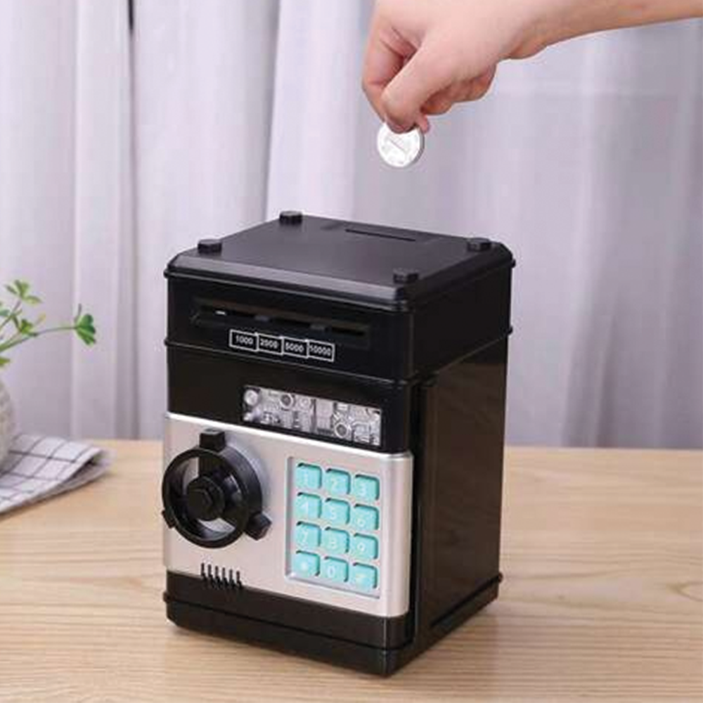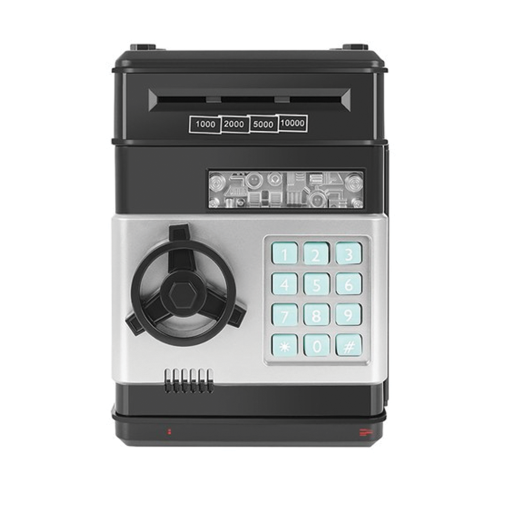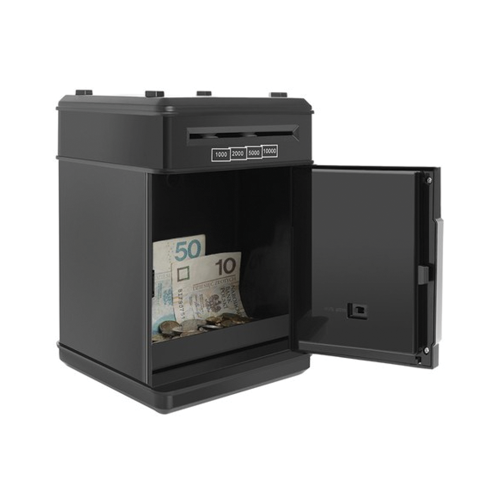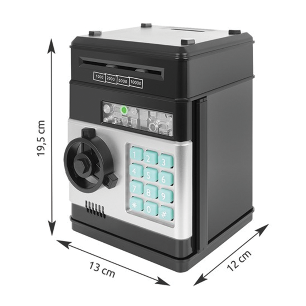 Dětská pokladnička trezor, černá funguje jako malý elektronický bankomat, do kterého si děti mohou ukládat své první úspory. Je navržena tak, aby byla nejen praktická, ale i zábavná - bankovky i mince lze pohodlně vkládat a po zadání správného čtyřmístného PIN kódu zase bezpečně vyjmout. Možnost nastavení vlastního hesla podporuje pocit odpovědnosti a učí děti základům hospodaření s penězi. Pokladnička je navíc doplněna o světelné a zvukové efekty, které ještě více zpestřují používání - klasické pípání lze dokonce přepnout na anglický hlas. Trezor po 20 sekundách upozorní, pokud zůstanou dveře otevřené, čímž podporuje správné návyky při ukládání úspor. Díky pevnému provedení a modernímu vzhledu je ideálním dárkem pro děti od 6 let, který spojuje hru s učením.