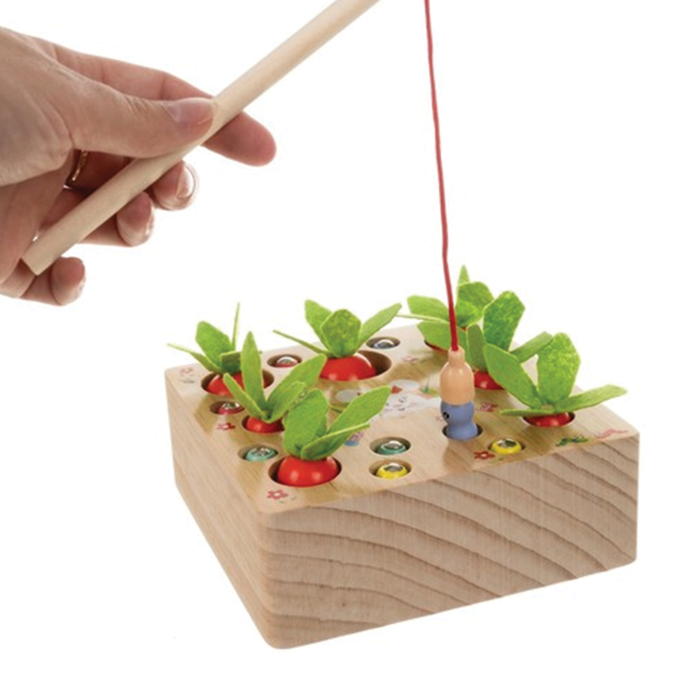 Dřevěná hra Mrkev a červíci je originální montessori vzdělávací hra 2v1, která kombinuje zábavu s učením. Děti se při hraní učí soustředit, rozpoznávat tvary a barvy a zároveň trénují jemnou motoriku i koordinaci oko-ruka. Každý prvek je vyroben z přírodních, netoxických a ekologických materiálů, takže je zcela bezpečný pro malé děti. Díky hladkému opracování dřeva nehrozí žádné zranění ani poškrábání. Hra pomáhá rozvíjet logické myšlení i představivost – dítě může zasazovat mrkev do otvorů nebo pomocí magnetického prutu „lovit“ červíky. Dřevěná zahrádka nabízí dvě různé aktivity v jedné - třídění podle velikosti a magnetickou hru. Je to ideální tip na dárek pro děti od 3 do 7 let, který spojuje kreativní hraní s učením. Tato hračka je ekologická, trvanlivá a odolná vůči intenzivnímu hraní - vydrží mnoho hodin radosti a objevování.