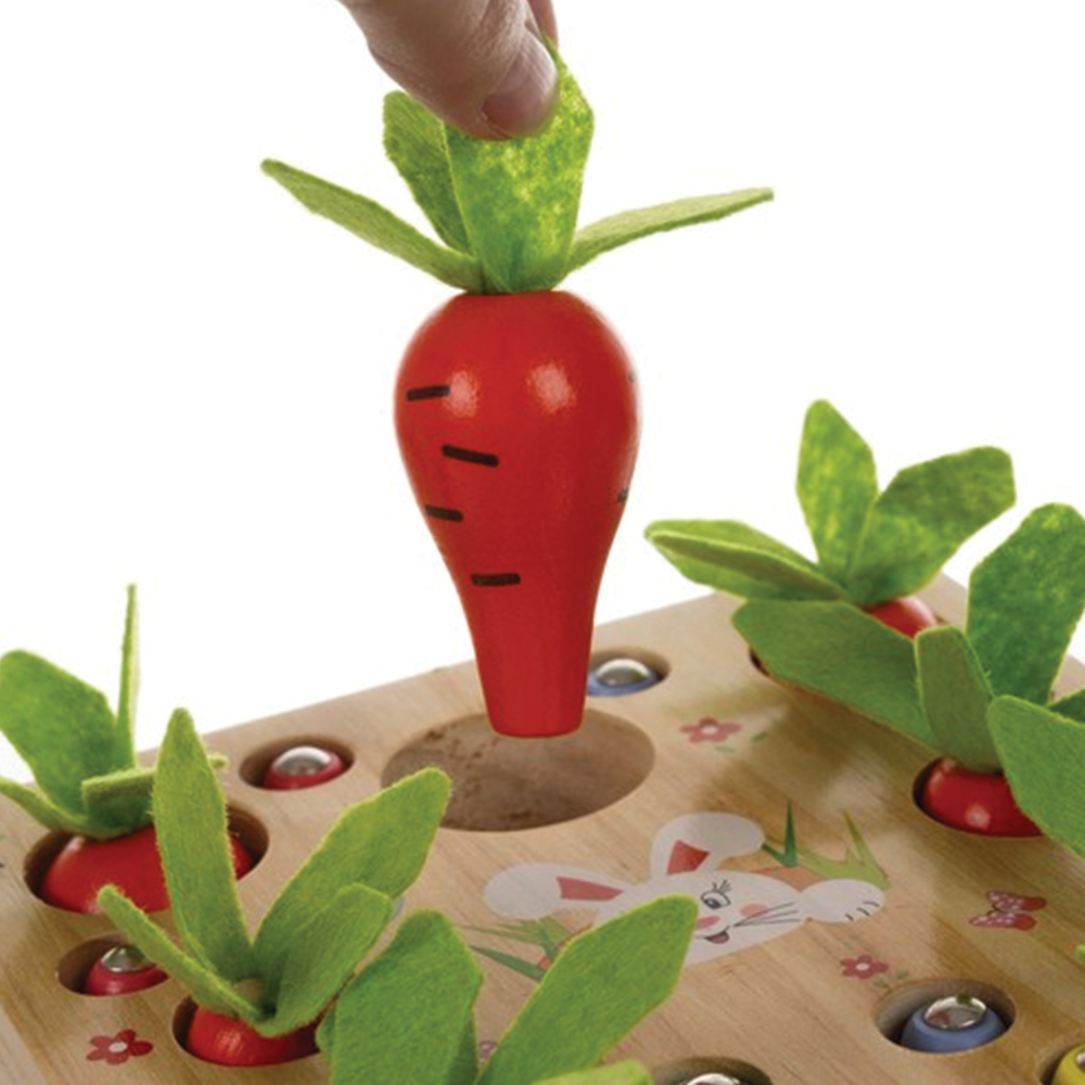 Rozvoj motoriky a smyslů: Hra se zaměřuje na intenzivní trénink jemné motoriky, úchopu a koordinace oko-ruka. Při zasazování mrkví do hlubokých otvorů se děti učí rozpoznávat tvary a prostorové vztahy, zatímco magnetický lov červíků vyžaduje přesnost a soustředění. Díky pestrobarevnému provedení hračka stimuluje zrakové vnímání a pomáhá dětem s prvním poznáváním barev a základních přírodních motivů.