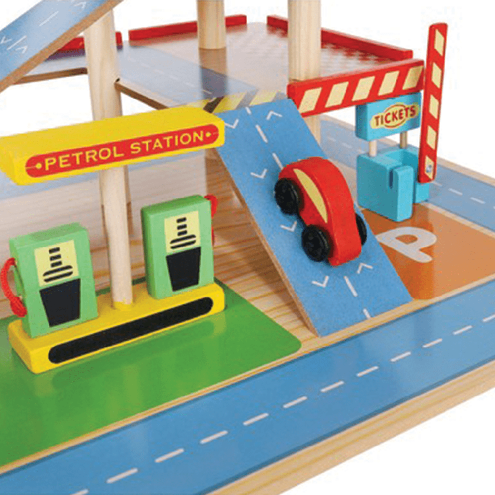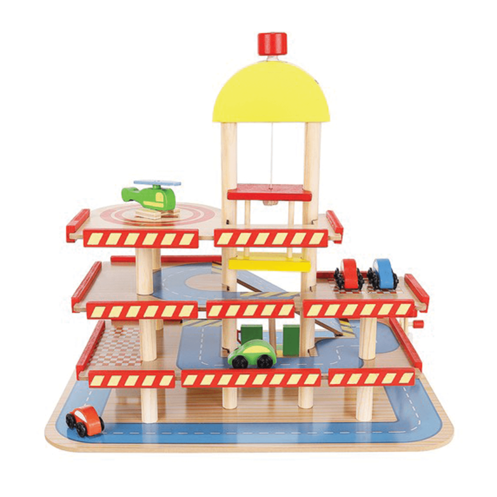 Velká dřevěná parkovací garáž s několika patry, autíčky a doplňky nabízí realistickou hru plnou zábavy a rozvoje motoriky. Bezpečné přírodní materiály a bohaté příslušenství z ní dělají ideální hračku pro malé milovníky aut. Konstrukce neobsahuje ostré hrany má pevné a odolné provedení a je uzpůsobena dětským rukám.