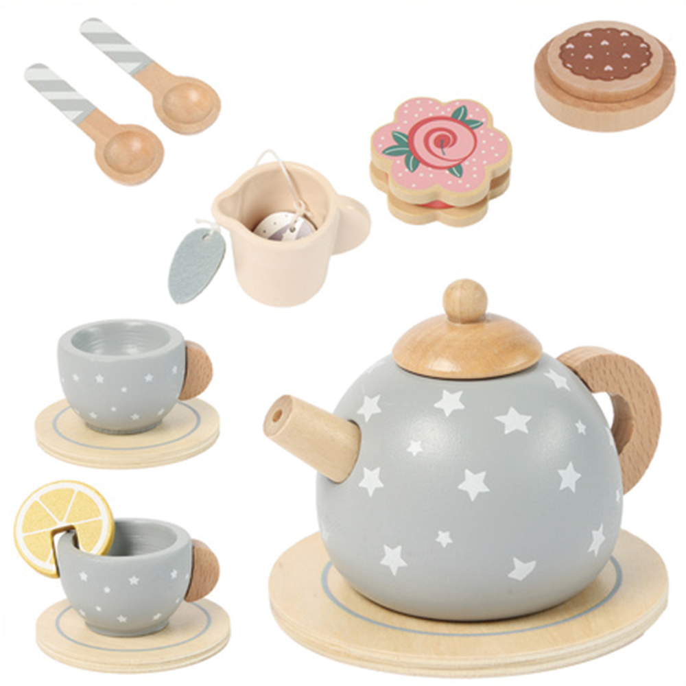 Dřevěný čajový set, 13 ks je víc než jen hračka - je to pozvánka do světa dětské představivosti, kde každý čaj chutná lépe, když je podávaný s láskou. Tato souprava v moderním šedém designu s pastelovými detaily je vyrobena z vysoce kvalitního přírodního dřeva a překližky, což zaručuje její mimořádnou odolnost vůči každodenním hrám. Všechny prvky jsou pečlivě vybroušeny do hladka a ošetřeny zdravotně nezávadnými barvami, díky čemuž set splňuje přísné evropské bezpečnostní normy pro děti od 3 let.