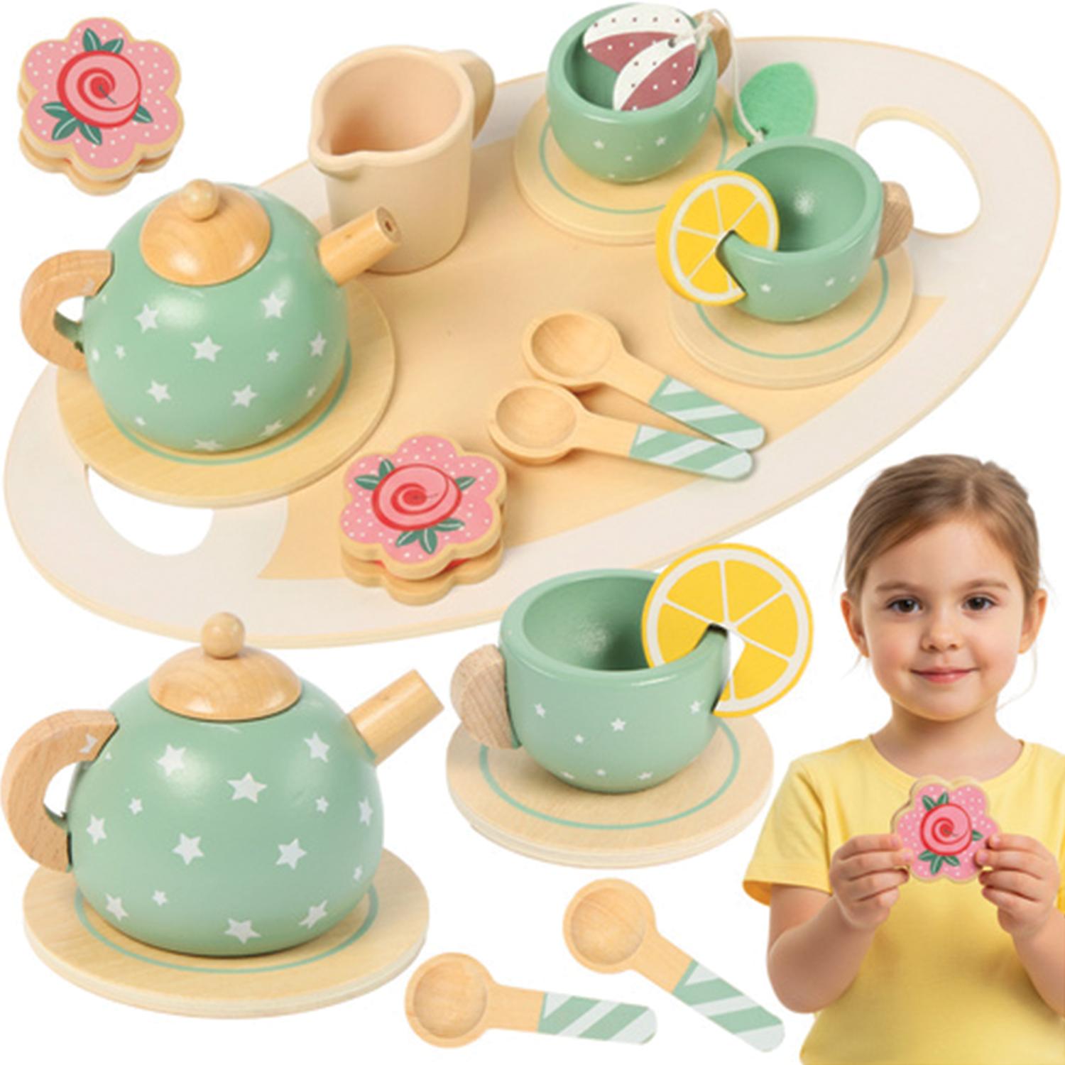 Součástí balení je tác, konvice, hrnky, podšálky, lžičky, dezerty i citron – kompletní výbava pro malou domácí čajovou párty. Díky kvalitním materiálům, hladkým hranám a bezpečným barvám je hračka vhodná pro děti od 3 let a představuje skvělý tip na dárek pro každou příležitost.