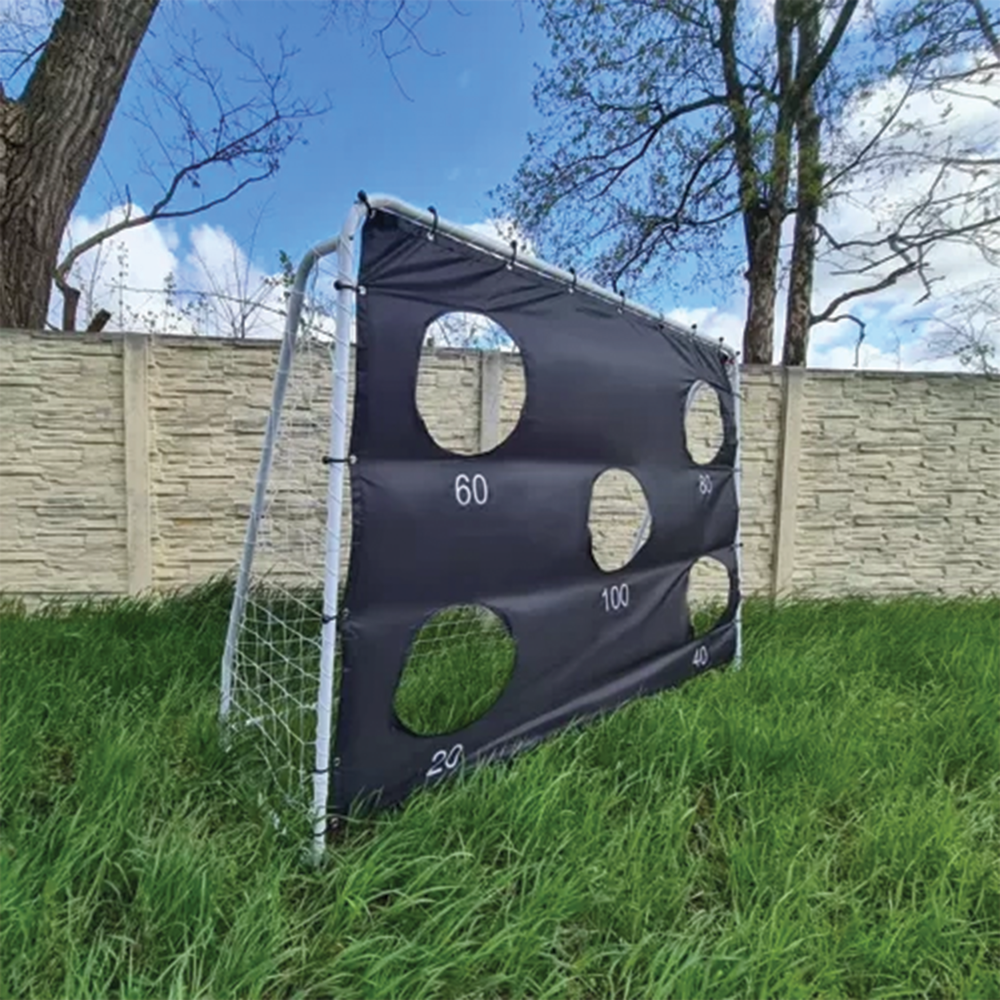 Fotbalová branka s cílovací plachtou je navržena pro efektivní trénink i volnočasovou hru. Součástí sady je speciální zaměřovací podložka, která zakrývá většinu branky a ponechává pouze několik bodovaných otvorů pro přesné střely. Tento systém pomáhá hráčům zlepšovat techniku, koncentraci a přesnost zakončení. Konstrukce branky je vyrobena z pevné oceli s tloušťkou trubek až 32 mm, což zaručuje vysokou stabilitu i při silných střelách. Pro ještě větší bezpečnost je možné branku upevnit k zemi pomocí přiložených kolíků. Síť z odolného PE materiálu spolehlivě zachytí míč a vydrží dlouhodobé používání. Velkou výhodou je rychlá montáž a demontáž díky klik systému, který umožňuje branku snadno složit, přenášet i skladovat bez zbytečné námahy. Branka je univerzální a hodí se jak pro začátečníky, tak pro pokročilé hráče – doma na zahradě, na hřišti i při sportovních kroužcích.