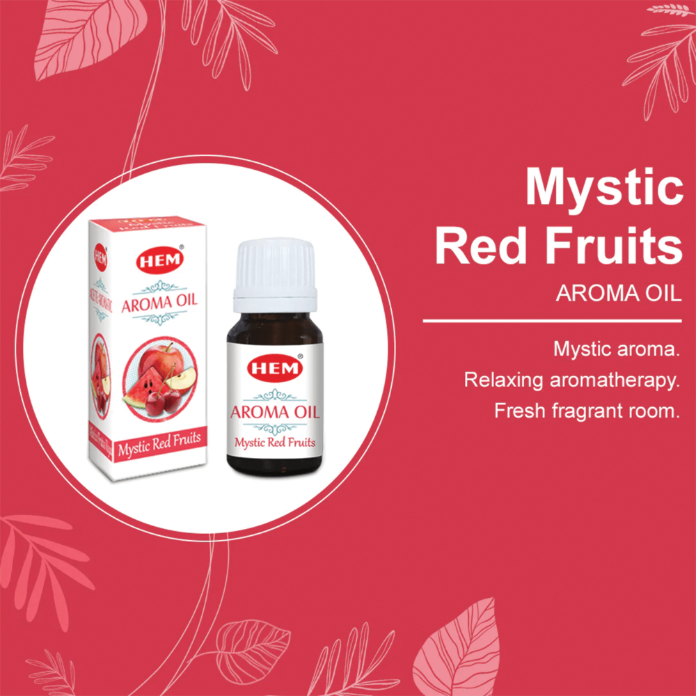 Vonný olej HEM Mystic Red Fruits je inspirován sladkou svěžestí zralého červeného ovoce – malin, jahod a lesních plodů. Jeho živé, ovocné a lehce sladké aroma okamžitě rozjasní interiér a vytvoří příjemnou, pozitivní atmosféru. Tato vůně působí energizujícím dojmem, zlepšuje náladu a přináší pocit lehkosti a radosti do každodenního života. Je ideální ve chvílích, kdy chcete prostor oživit, osvěžit a dodat mu letní nádech vitality. Díky vysoké koncentraci přírodních vonných složek stačí jen několik kapek do difuzéru nebo aroma lampy pro dlouhotrvající provonění místnosti.