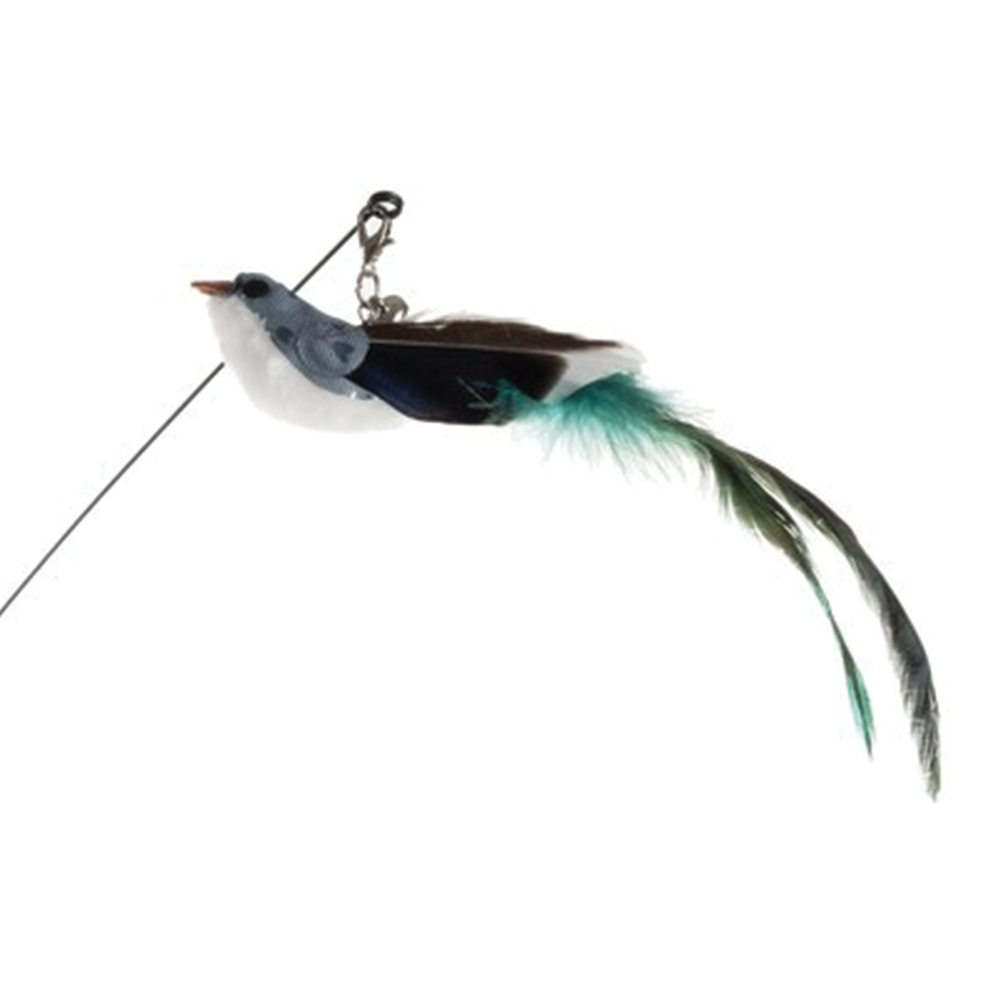Prut s atraktivní kořistí: Dlouhá pružná tyč zakončená ptáčkem s peřím a zvonkem vytváří dynamický a zábavný pohyb.