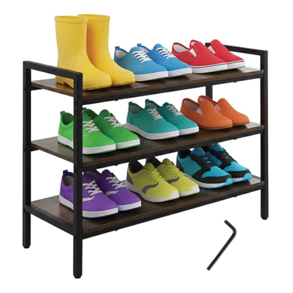 Kovový botník se 3 dřevěnými policemi – stabilní loftový stojan na obuv a doplňky