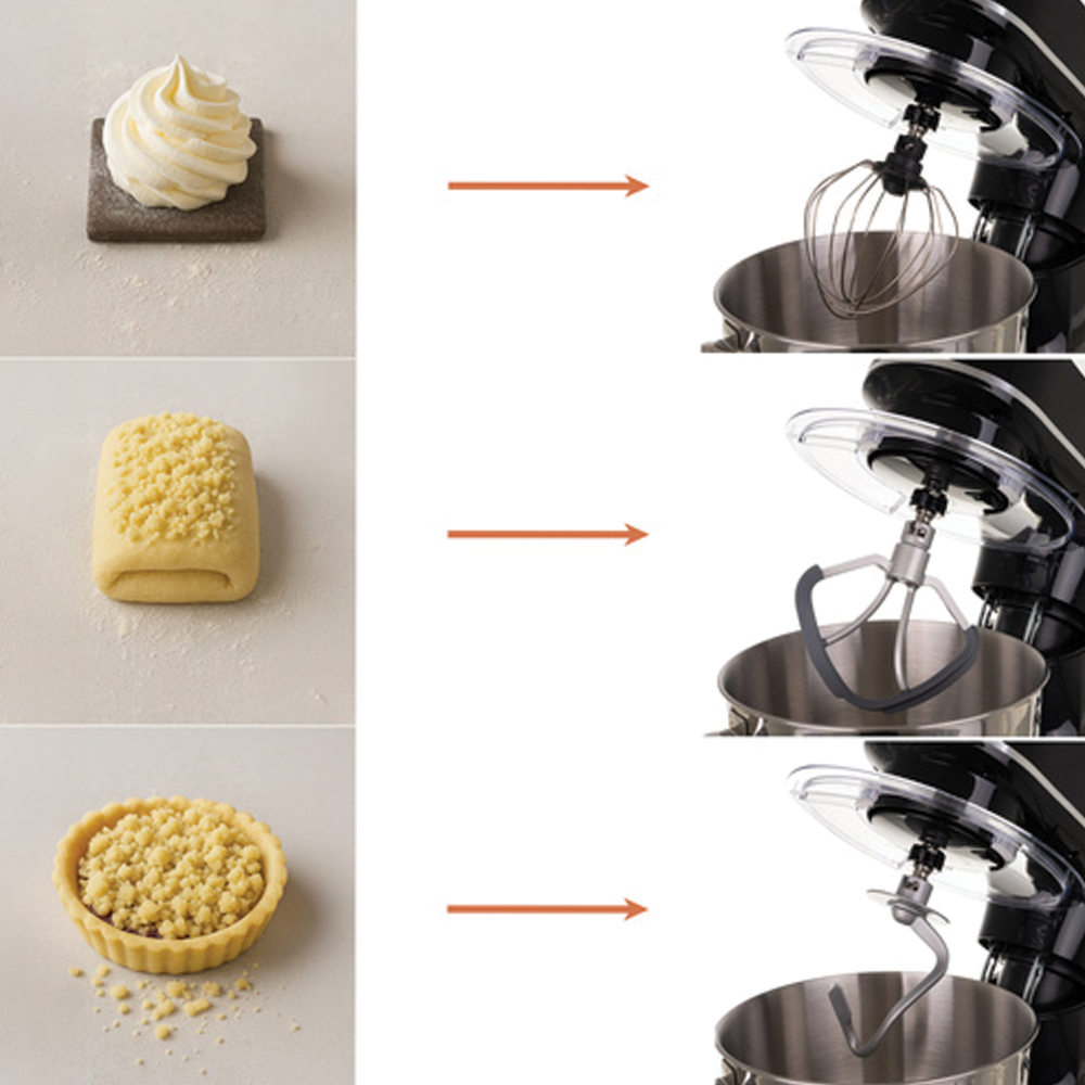 Planetární systém pro perfektní texturu: Díky planetárnímu pohybu nástavců, které se točí kolem své osy i po obvodu mísy, je zaručeno stoprocentní propracování surovin bez nepromíchaných míst. Sada obsahuje hnětací hák pro těžká těsta, plochou metlu na krémy a balónovou metlu pro extra nadýchaný sníh, což z robota dělá komplexního pomocníka pro každou kulinářskou výzvu.