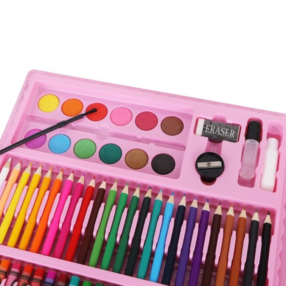 Malířská sada v kufru, 168 dílků, růžová je splněným snem každého dítěte, které miluje tvoření a barvy. Tato mimořádně bohatá sada obsahuje vše potřebné pro kresbu, malbu i stínování – od klasických pastelek a fixů přes syté olejové a svíčkové pastely až po akvarelové barvy s paletou. Součástí jsou i nezbytné doplňky jako guma, ořezávátko, lepidlo či čisté listy papíru, takže malování může začít ihned po otevření kufříku. Celá výbava je laděna tak, aby vyhovovala jak začínajícím umělcům od 3 let, tak i starším dětem navštěvujícím kurzy kreslení.