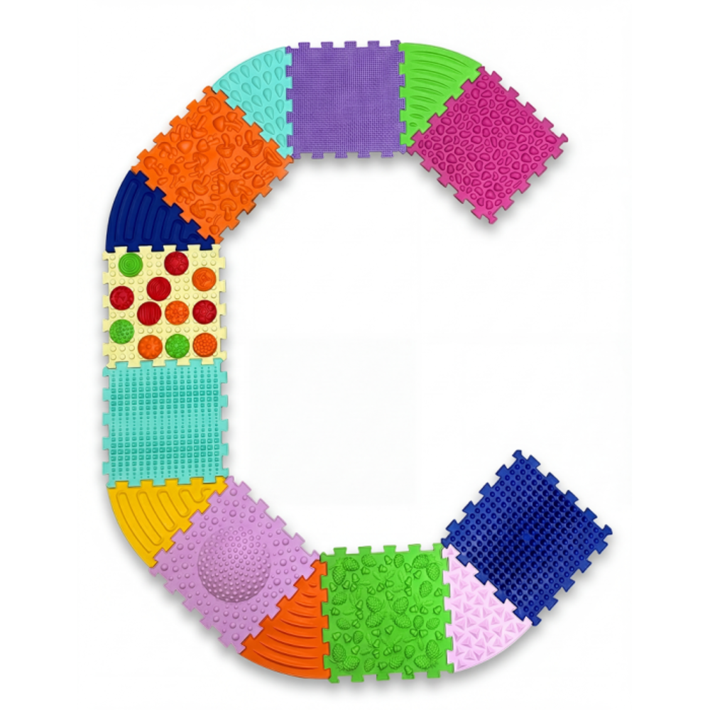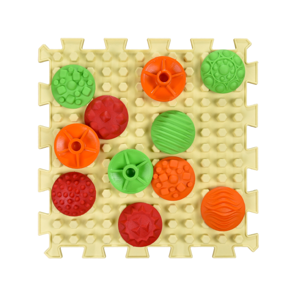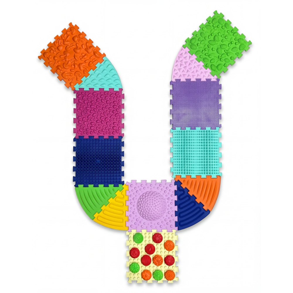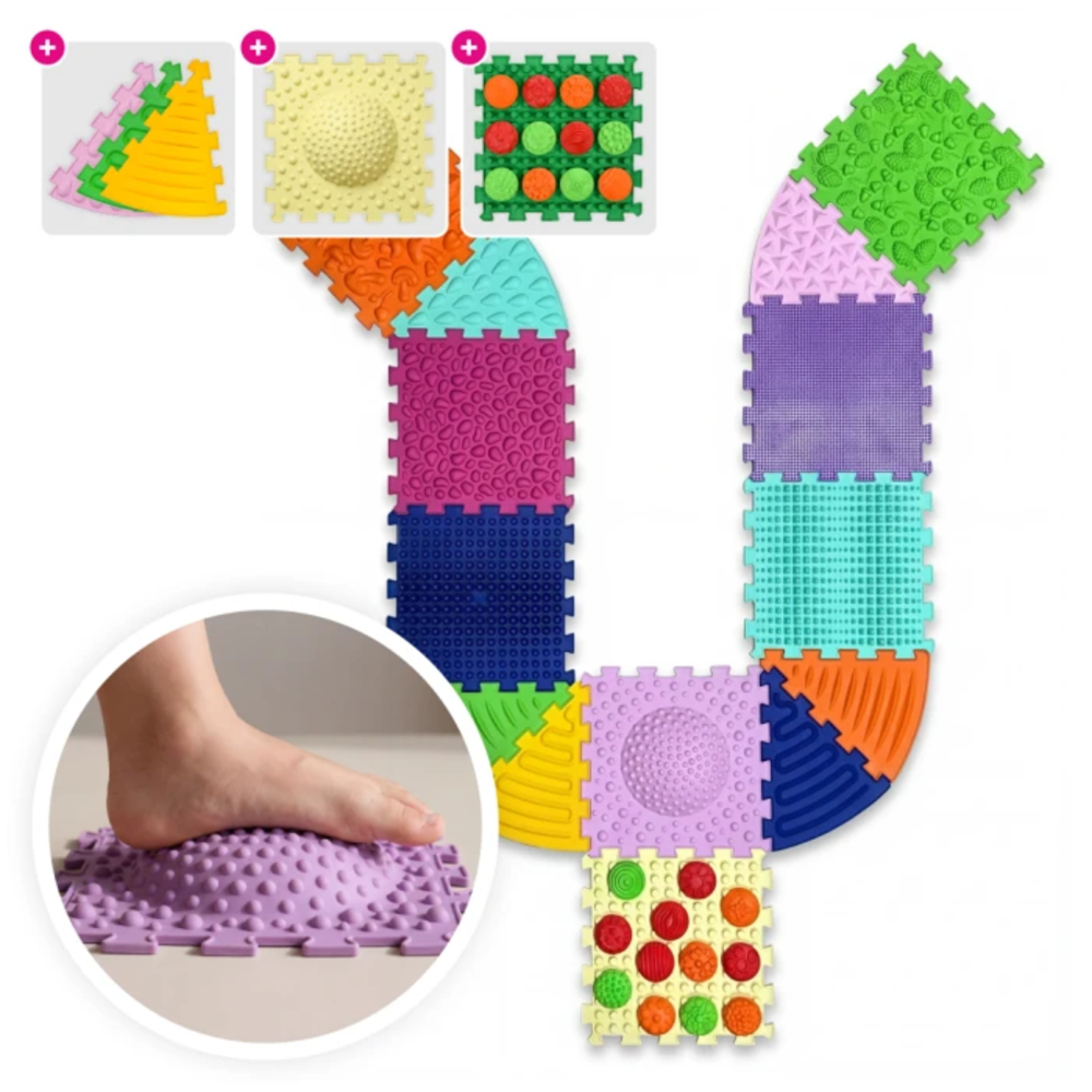Masážní podložka s 8 čtvercovými, 6 trojúhelníkovými a 12 senzorickými díly rozvíjí rovnováhu, koordinaci a jemnou motoriku. Barevné díly stimulují hmat a různé povrchy podporují masáž chodidel. Bosu modul posiluje svaly a stabilitu při cvičení. Ideální pro prevenci plochonoží a podporu dětského pohybu.