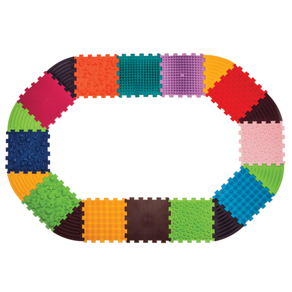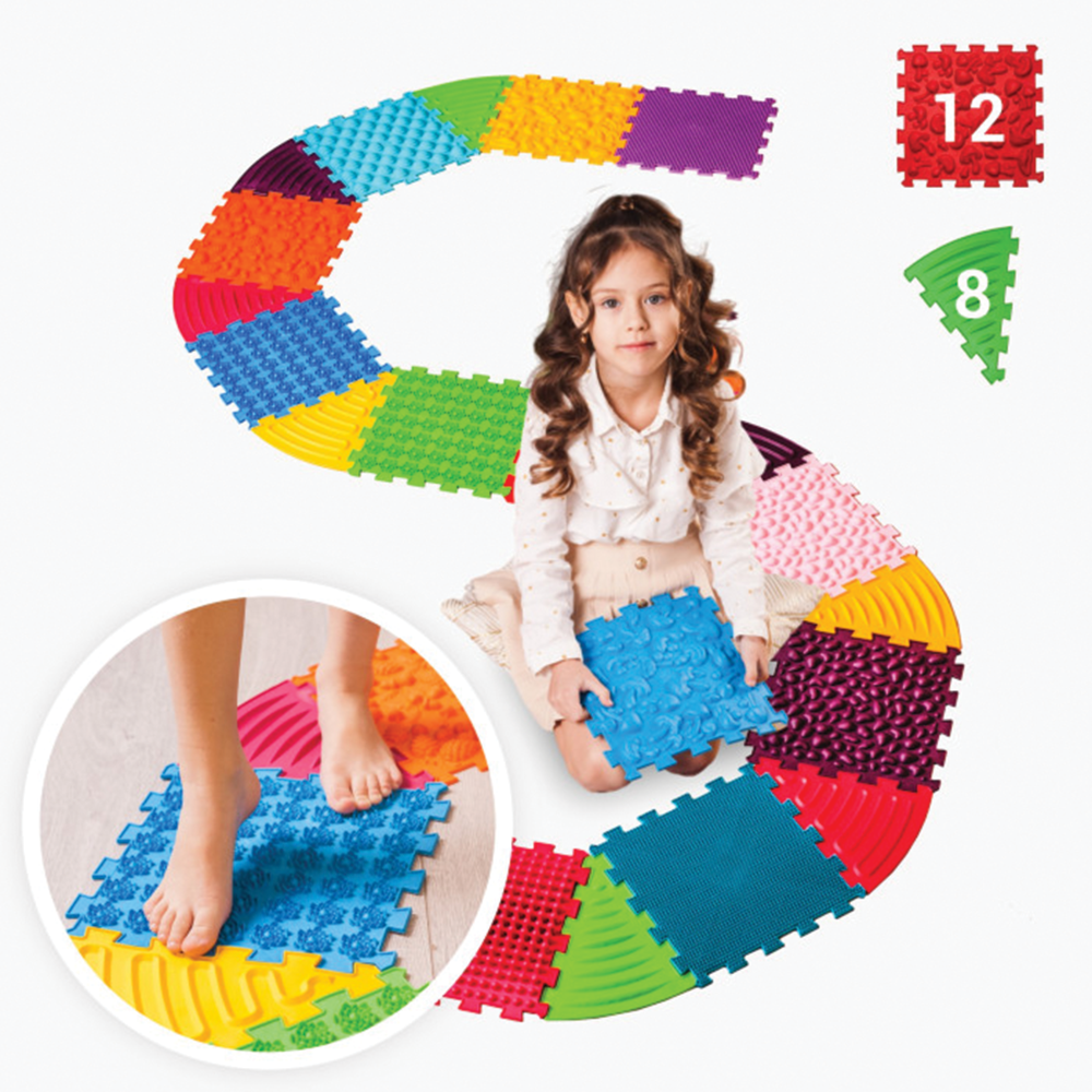 Masážní podložka Ortek je sestavena z 12 čtvercových a 8 trojúhelníkových puzzle dílů, které umožňují vytvářet nejen klasické rovné plochy, ale také vlnité dráhy, kruhy a originální tvary přizpůsobené prostoru místnosti. Díky rohovým trojúhelníkovým modulům lze snadno obcházet nábytek, šetřit místo a zároveň podporovat dětskou kreativitu a chuť k pohybu. Různorodé povrchy jednotlivých puzzle stimulují nervová zakončení v chodidlech, zlepšují krevní oběh a aktivně posilují podélnou i příčnou klenbu nohy. Kombinace měkčích, středně tvrdých a tvrdších struktur zajišťuje komplexní masážní efekt a optimální senzorickou integraci.