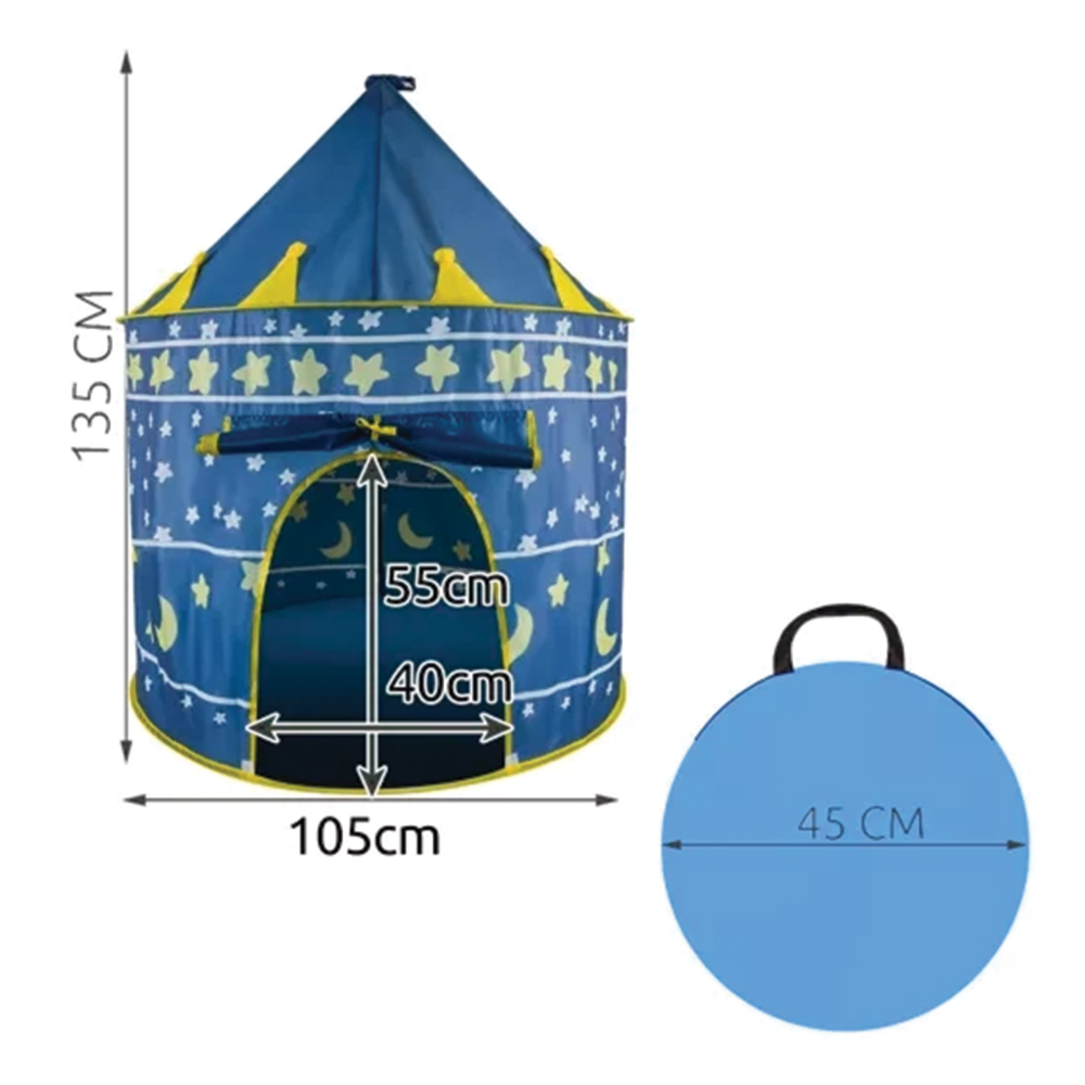 Dětský stan v námořnické modré barvě je kouzelný prostor pro každého malého prince i princeznu. Poskytuje ideální místo pro hraní doma i venku, rozvíjí představivost a vytváří jedinečnou atmosféru plnou fantazie a dobrodružství. Stan lze využít jako herní koutek i jako úložný prostor pro hračky. Dvě síťovaná okna a vchod na suchý zip zajišťují dostatek světla a vzduchu, zatímco pevný rám poskytuje bezpečí při hře. Díky kvalitnímu materiálu je stan odolný proti poškození a nemá ostré hrany, takže je zcela bezpečný pro děti. Kouzelný palác podporuje kreativní a skupinovou hru - pojme více dětí najednou a stane se oblíbeným místem pro společné chvíle. Jeho krásné barvy podněcují dětskou fantazii a přirozeně rozvíjejí tvořivost. Stan se snadno skládá i rozkládá - během několika minut jej postavíte nebo uložíte do praktické tašky s madlem, která umožňuje pohodlné přenášení a skladování. Ideální pro domov, zahradu, piknik i dovolenou.