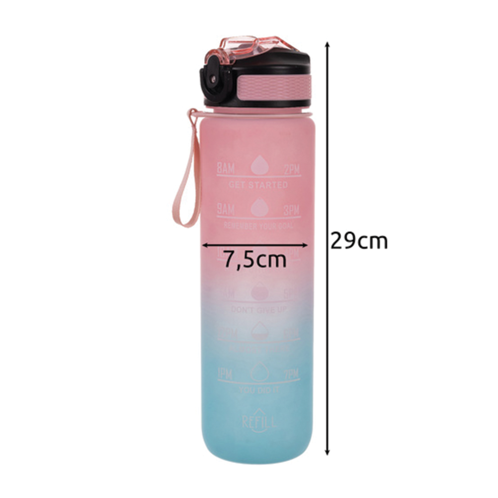 Motivační láhev o objemu 1000 ml v moderním modro-růžovém provedení je ideálním společníkem pro každodenní hydrataci. Díky praktickému designu, časové stupnici a motivačním nápisům vám pomůže udržet správný pitný režim doma, v práci i při sportu. Lehká, odolná a bezpečná konstrukce zajišťuje pohodlné používání po celý den.