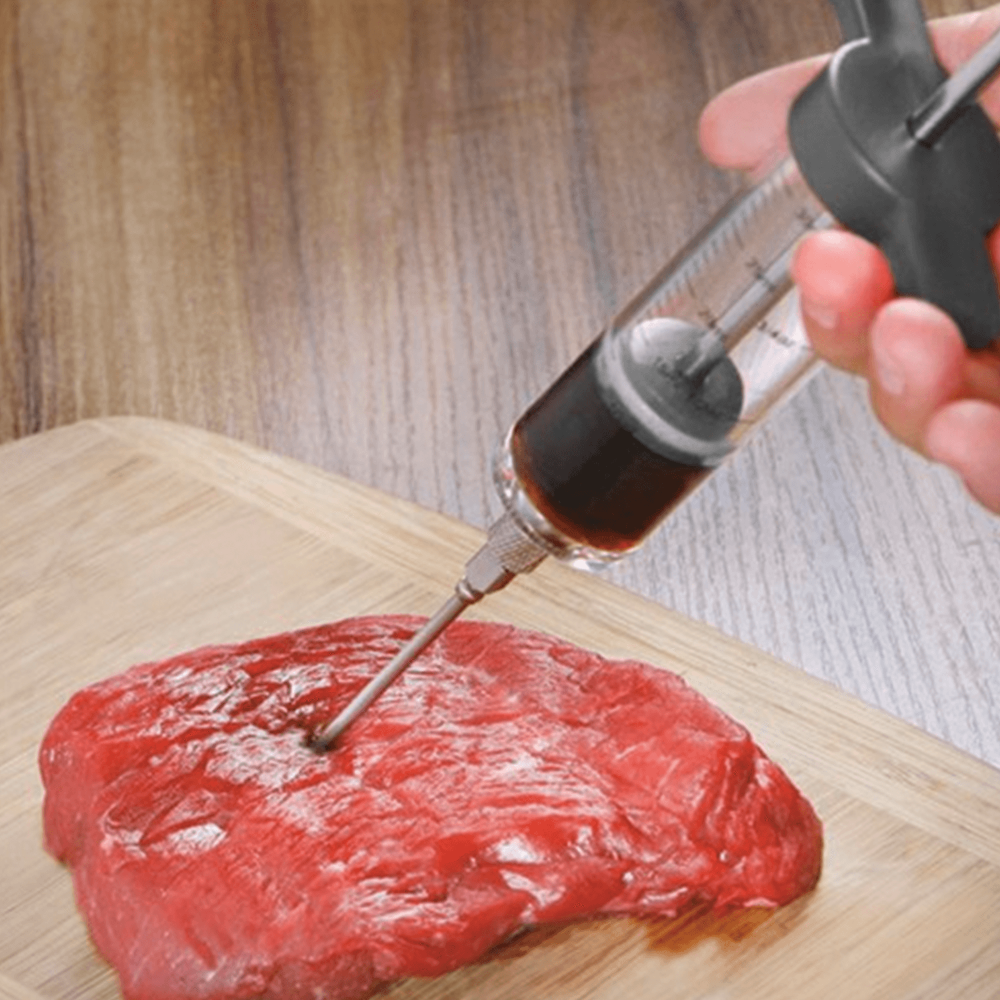 Praktická injekční stříkačka na maso je vyrobena z odolných a zdravotně nezávadných materiálů, které zajišťují dlouhou životnost a bezpečné používání. Umožňuje rovnoměrné vstřikování marinády, solného nálevu a koření přímo do masa, čímž zlepšuje jeho chuť, šťavnatost a urychluje proces nakládání. Díky třem různým jehlám je vhodná pro různé druhy masa a způsoby přípravy.