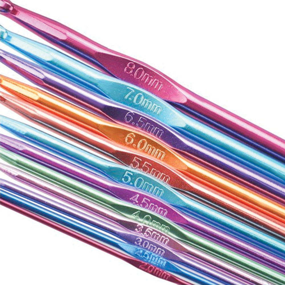 Vše potřebné na jednom místě: 12 háčků různých velikostí (2–8 mm) pokryje široké spektrum projektů – od jemných krajek po silnější přízi.