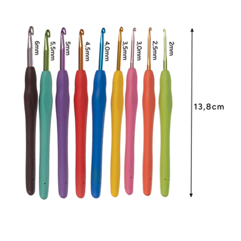 Přehledné a ergonomické háčky: Každý háček má jasně označenou velikost a ergonomické zploštění, které zabraňuje únavě rukou i při delším pletení.