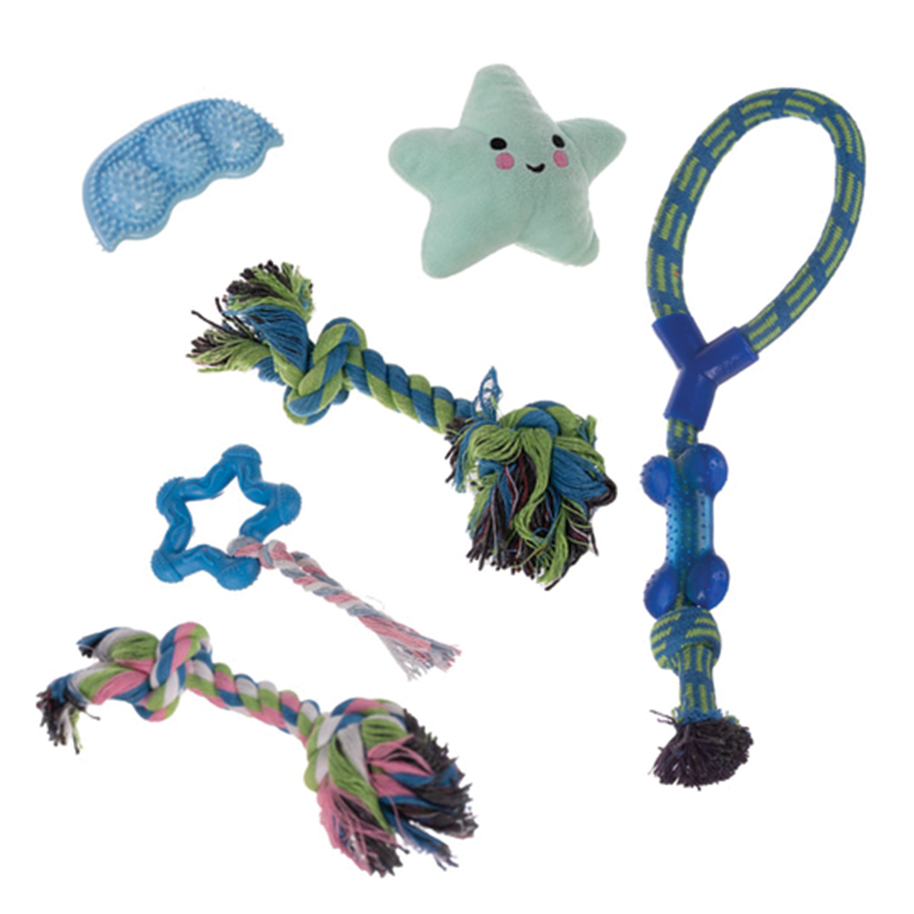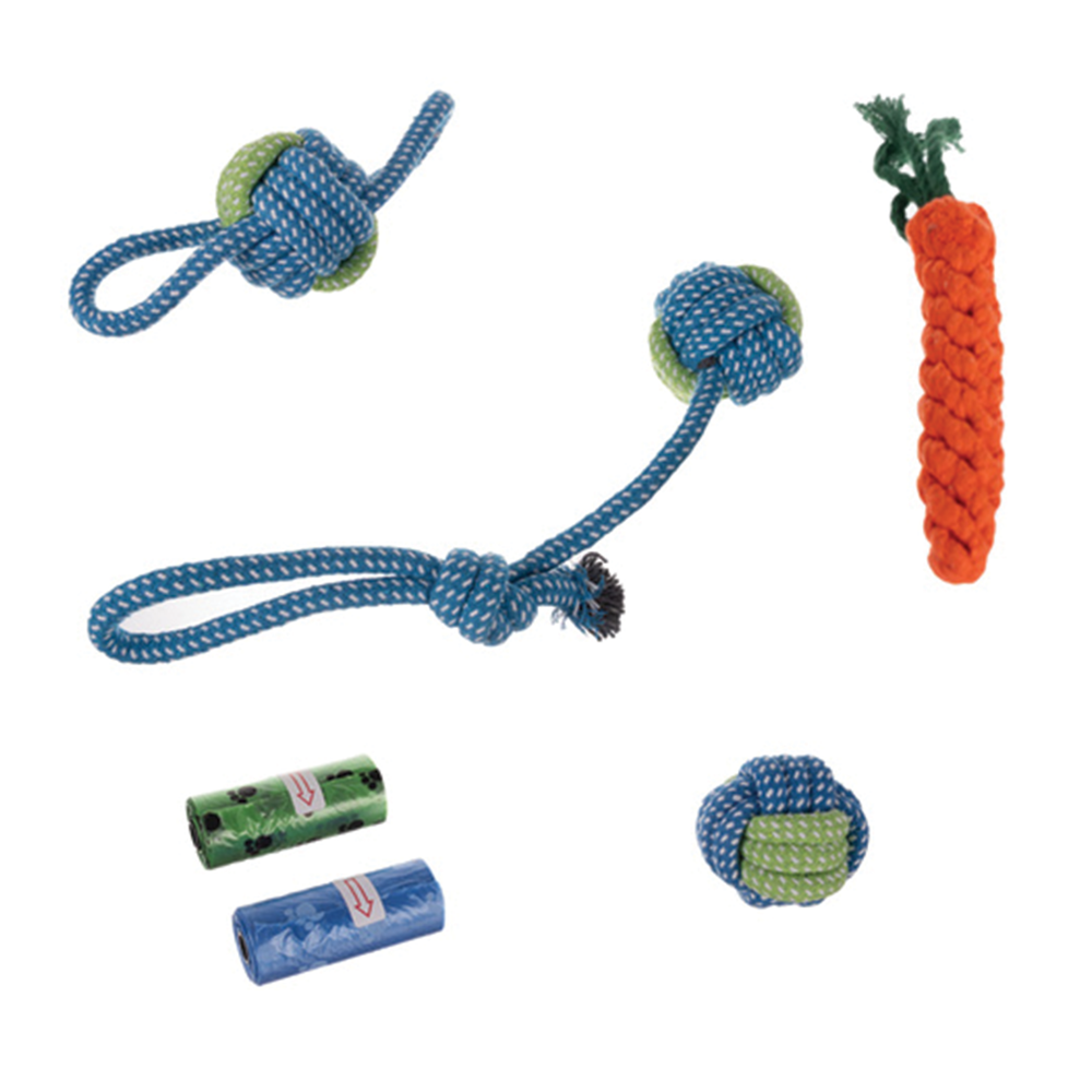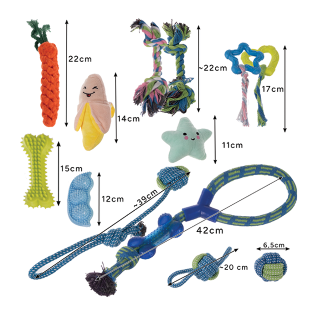 Dopřejte svému mazlíčkovi radost a zábavu s praktickou sadou 16 hraček. Sada obsahuje různé druhy hraček - od lanových tahadel, gumových kousátek, plyšových maskotů až po frisbee či sáčky na exkrementy. Hračky byly navrženy tak, aby podporovaly přirozené potřeby psa, udržovaly jej aktivního a zároveň chránily jeho chrup.