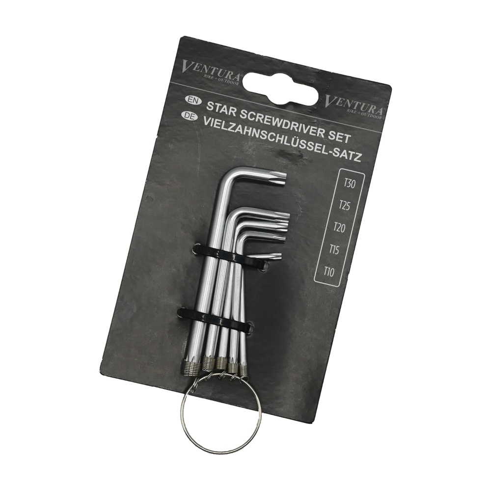 Sada klíčů na kroužku je ideálním doplňkem do domácí dílny i pro mobilní servisní výbavu každého cyklisty. Klíče jsou vyrobeny z kvalitní oceli s pozinkovanou povrchovou úpravou, která zaručuje vysokou odolnost proti korozi a dlouhou životnost. Sada zahrnuje pět klíčových velikostí - T10, T15, T20, T25 a T30 - které pokrývají většinu torxových spojů na moderních kolech, od brzdových kotoučů až po řazení a další komponenty. Specifickou vlastností těchto klíčů je jejich konstrukce vhodná pro tzv. „security“ (bezpečnostní) šrouby s čepem uprostřed. Každý klíč je zahnutý do tvaru písmene „L“, přičemž nabízí krátký konec pro maximální přenos síly a dlouhý konec pro práci v hlubších nebo hůře dostupných místech. Praktický ocelový kroužek zajišťuje, že se vám klíče v brašně nebo v dílně nerozházejí, a zároveň umožňuje celou sadu kamkoliv zavěsit.