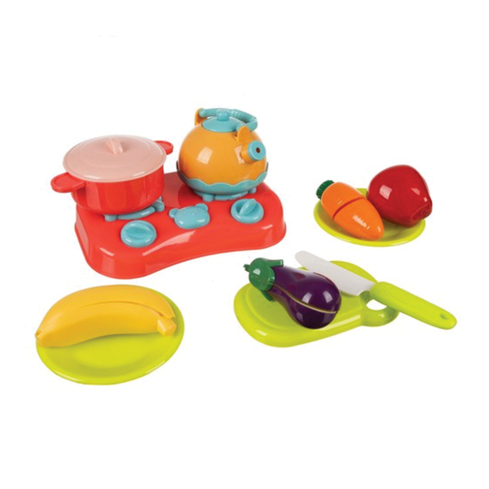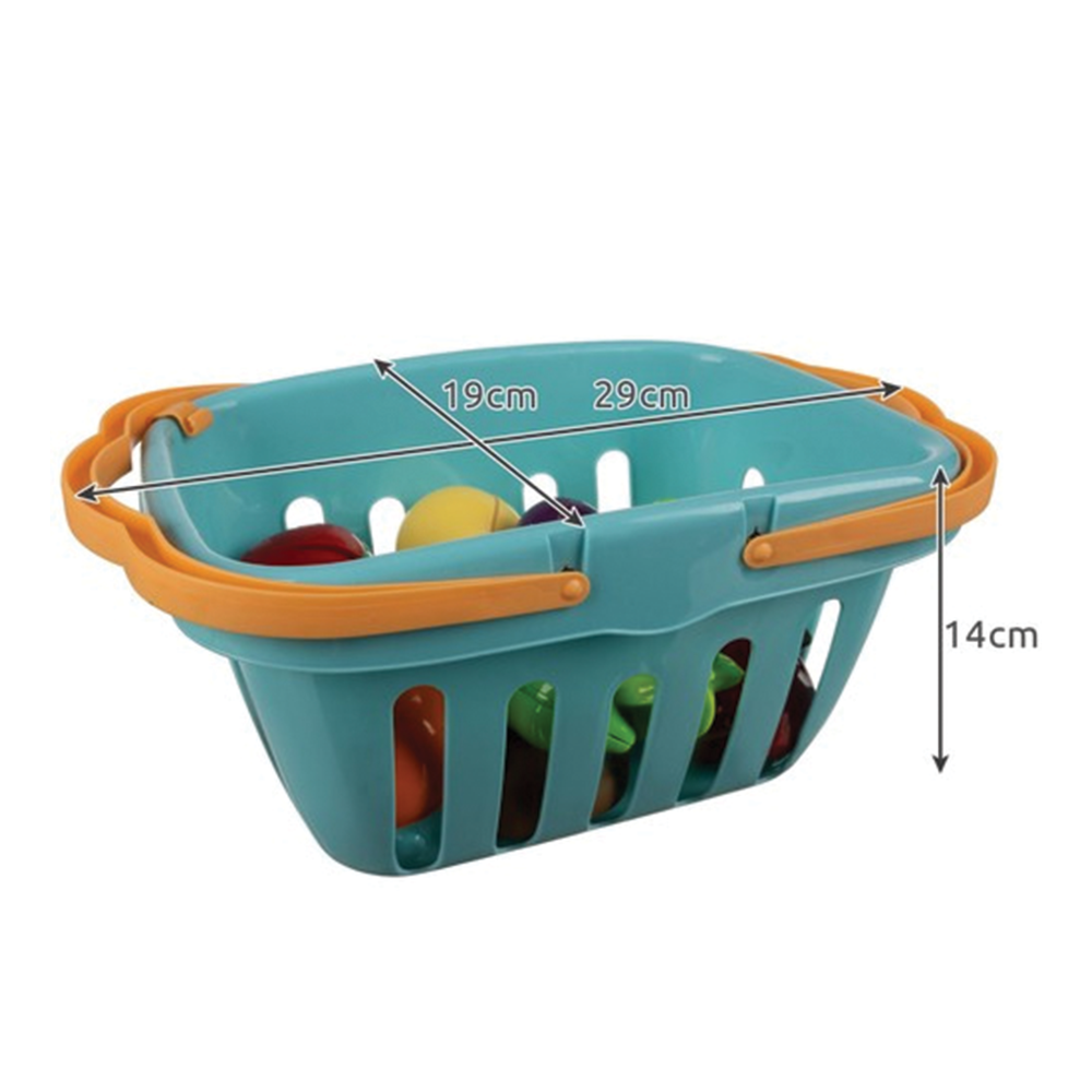Košík s víkem, mini sporák, varná konvice, hrnec, víčko, prkénko, nůž, 2× talíř, pomeranč, lilek, hruška, hrášek, kukuřice, jablko, banán, vejce, mrkev, jahoda, kiwi, pepř, karambola.