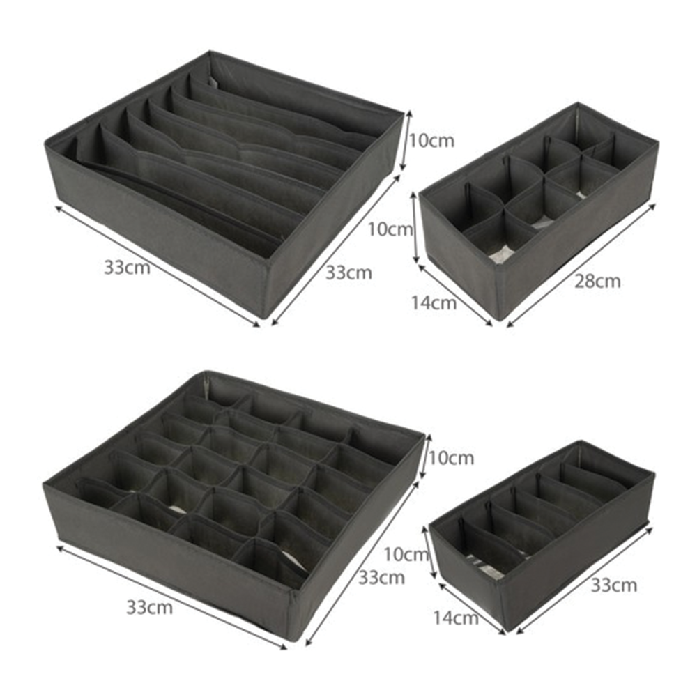 Skládací organizér na spodní prádlo 4 ks, šedý je praktická sada, která pomáhá udržet pořádek v zásuvkách a skříních. Čtyři různé organizéry umožňují ukládat ponožky, podprsenky, kalhotky nebo jiné drobnosti přehledně a efektivně.
