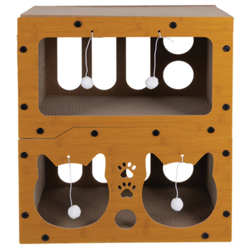 Dvouúrovňový design nabízí kočkám různé zóny komfortu: spodní uzavřený domeček slouží jako bezpečné útočiště pro spánek, zatímco horní patro funguje jako vyvýšený pelíšek s přehledem o okolí. Sada obsahuje čtyři senzorické míčky, které motivují k pohybu a pomáhají uvolňovat přebytečnou energii. Celý produkt je navržen s důrazem na ekologii a bezpečnost - neobsahuje toxiny ani ostré hrany. Intuitivní montáž bez nutnosti použití nářadí umožňuje škrabadlo zprovoznit během několika málo minut.