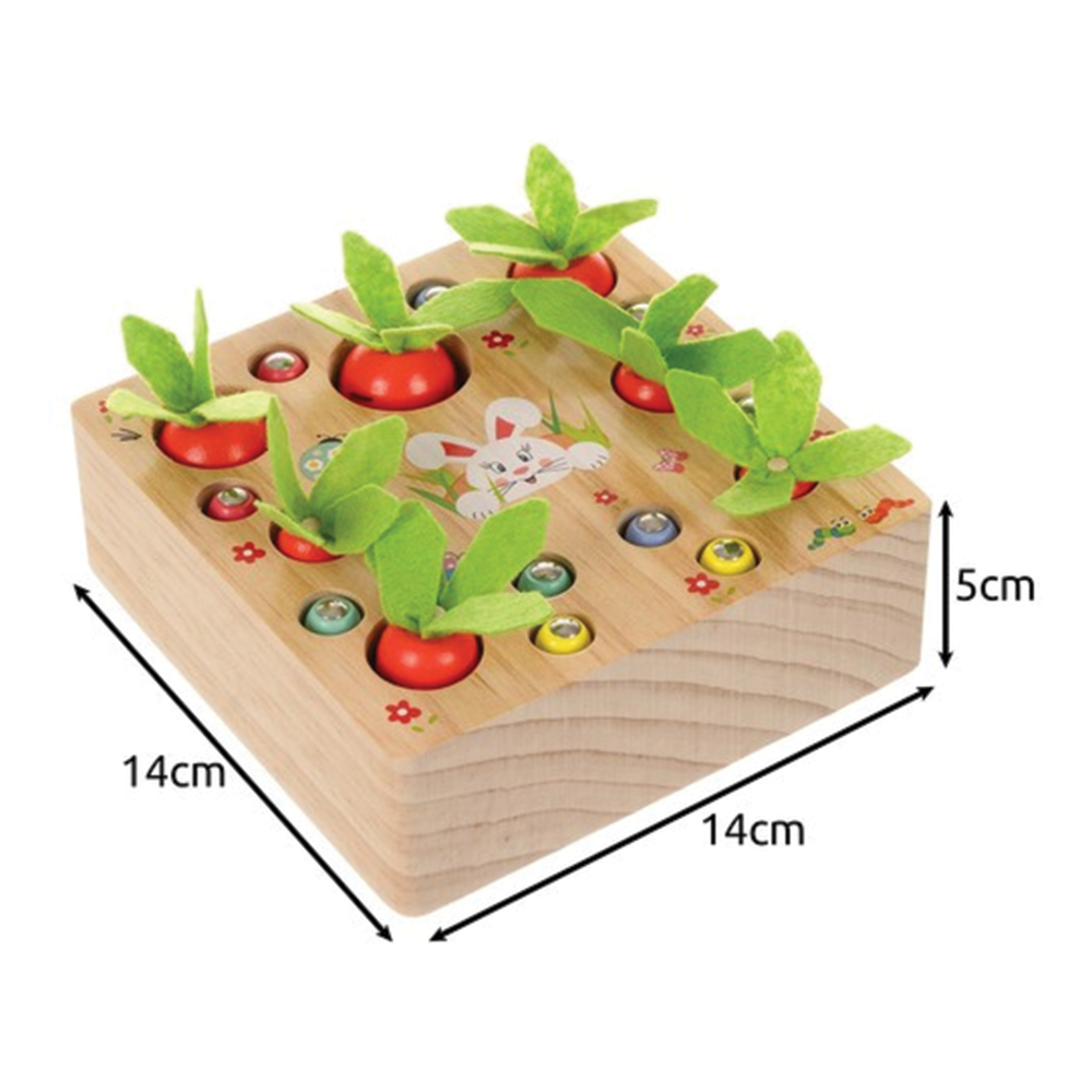 Dřevěná hra Mrkev a červíci je originální montessori vzdělávací hra 2v1, která kombinuje zábavu s učením. Děti se při hraní učí soustředit, rozpoznávat tvary a barvy a zároveň trénují jemnou motoriku i koordinaci oko-ruka. Každý prvek je vyroben z přírodních, netoxických a ekologických materiálů, takže je zcela bezpečný pro malé děti. Díky hladkému opracování dřeva nehrozí žádné zranění ani poškrábání. Hra pomáhá rozvíjet logické myšlení i představivost – dítě může zasazovat mrkev do otvorů nebo pomocí magnetického prutu „lovit“ červíky. Dřevěná zahrádka nabízí dvě různé aktivity v jedné - třídění podle velikosti a magnetickou hru. Je to ideální tip na dárek pro děti od 3 do 7 let, který spojuje kreativní hraní s učením. Tato hračka je ekologická, trvanlivá a odolná vůči intenzivnímu hraní - vydrží mnoho hodin radosti a objevování.