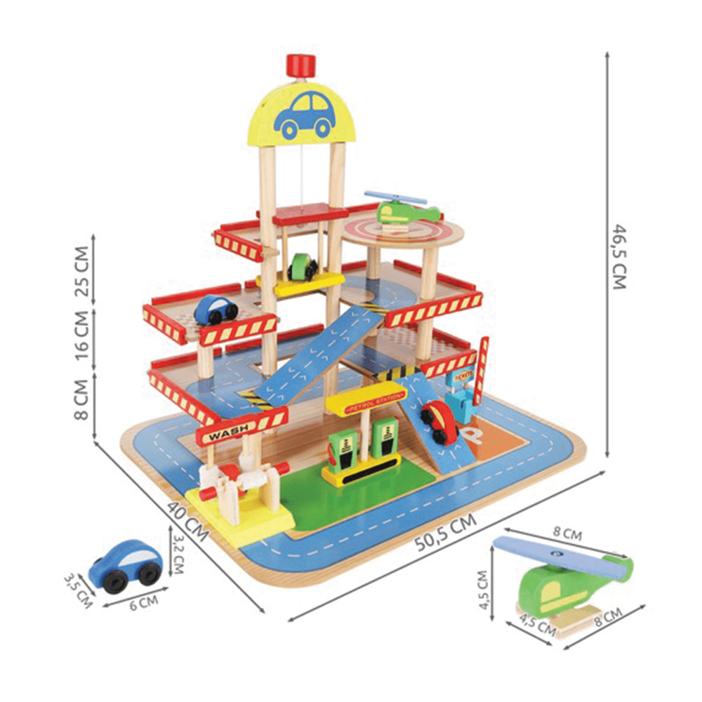 Dřevěná parkovací garáž pro děti je propracovaná herní sada, která po složení vytvoří realistické vícepatrové parkoviště plné detailů. Obsahuje myčku, čerpací stanici, pokladnu, silnice, výtah, čtyři autíčka i vrtulník s přistávací plochou. Díky několika úrovním mohou děti jezdit s auty po rampách, parkovat je a přehrávat si každodenní dopravní situace. Hračka je vyrobena z kvalitního dřeva a natřena zdravotně nezávadnými barvami, což zajišťuje bezpečnost i dlouhou životnost. Konstrukce neobsahuje ostré hrany a je uzpůsobena dětským rukám. Garáž podporuje rozvoj představivosti, jemné motoriky, koordinace i sociálních dovedností při hře s kamarády nebo rodiči.