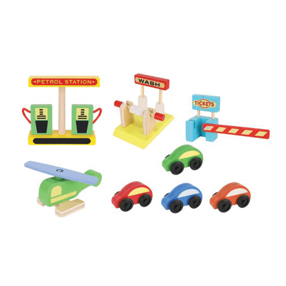 Bohatá sada: Auta, vrtulník, myčka, čerpací stanice a další prvky.