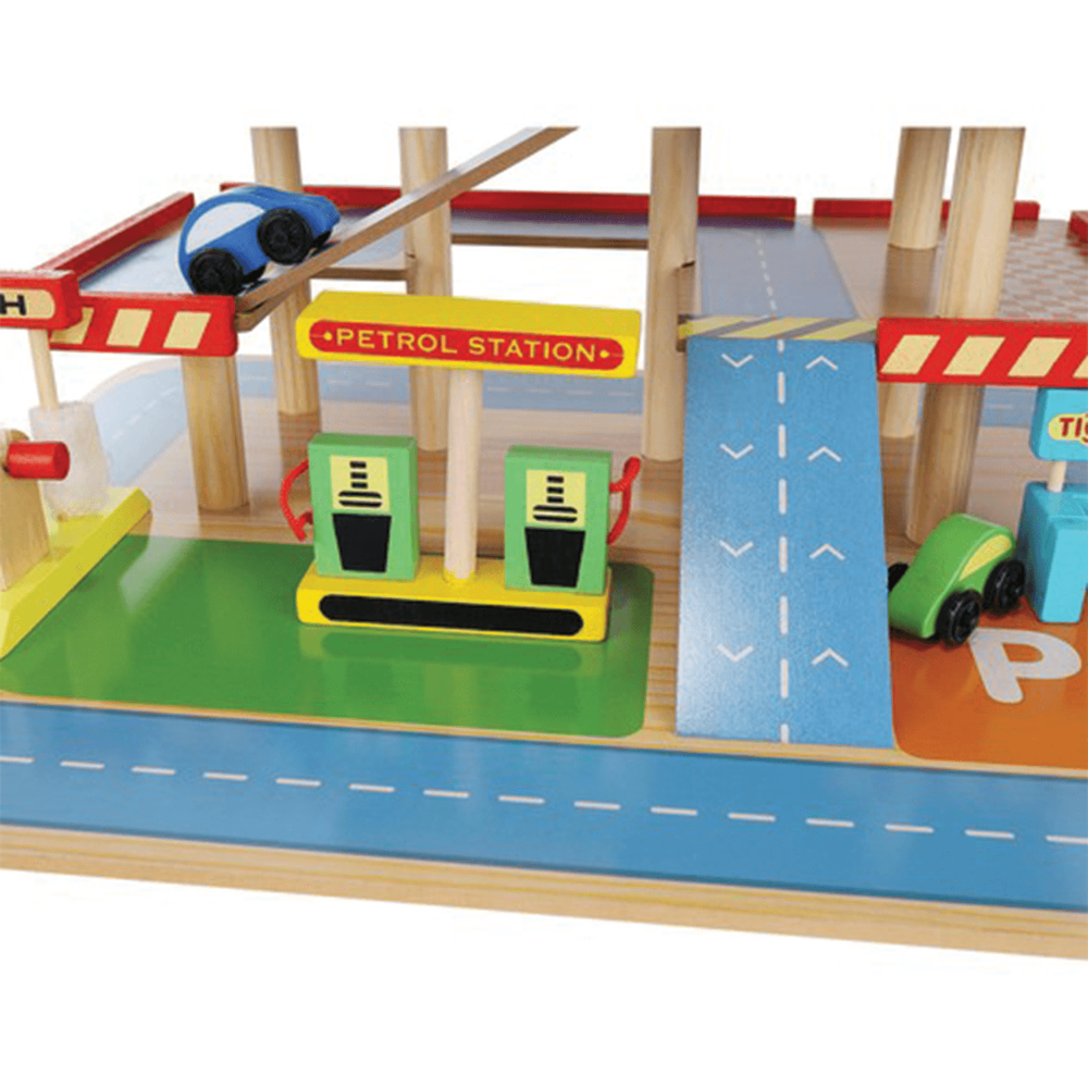 Velká dřevěná parkovací garáž s několika patry, autíčky a doplňky nabízí realistickou hru plnou zábavy a rozvoje motoriky. Bezpečné přírodní materiály a bohaté příslušenství z ní dělají ideální hračku pro malé milovníky aut. Konstrukce neobsahuje ostré hrany má pevné a odolné provedení a je uzpůsobena dětským rukám.