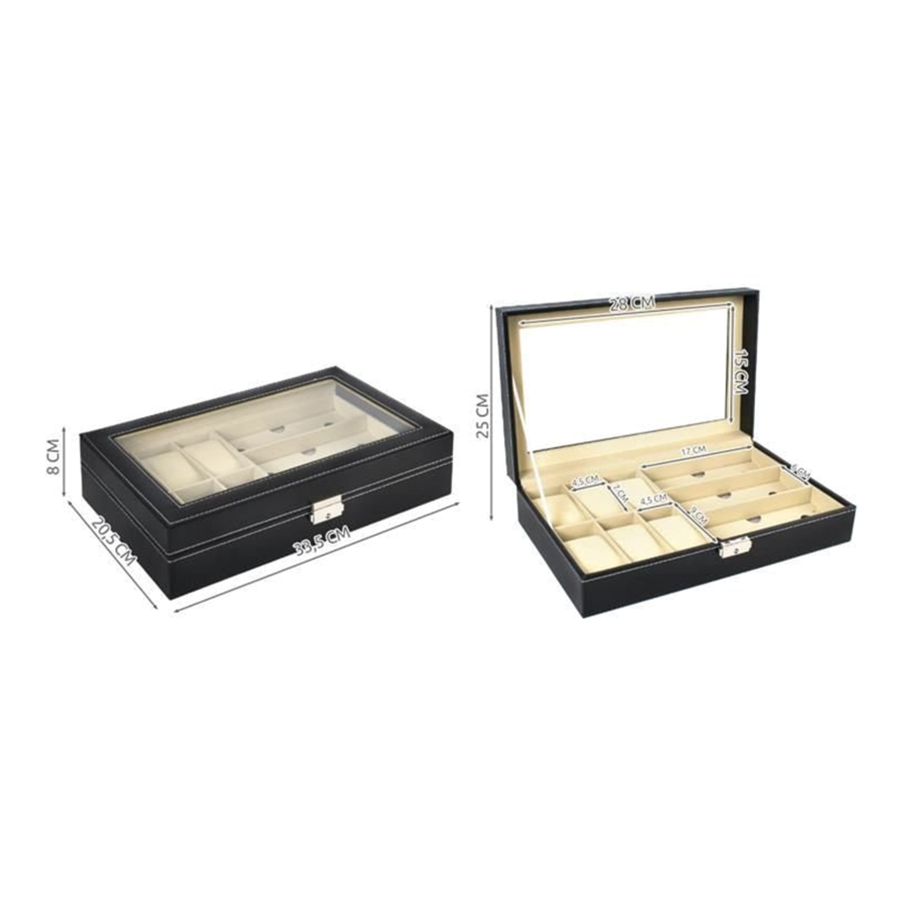 Praktické rozložení přihrádek: 6 přihrádek na hodinky + 3 přihrádky na brýle.