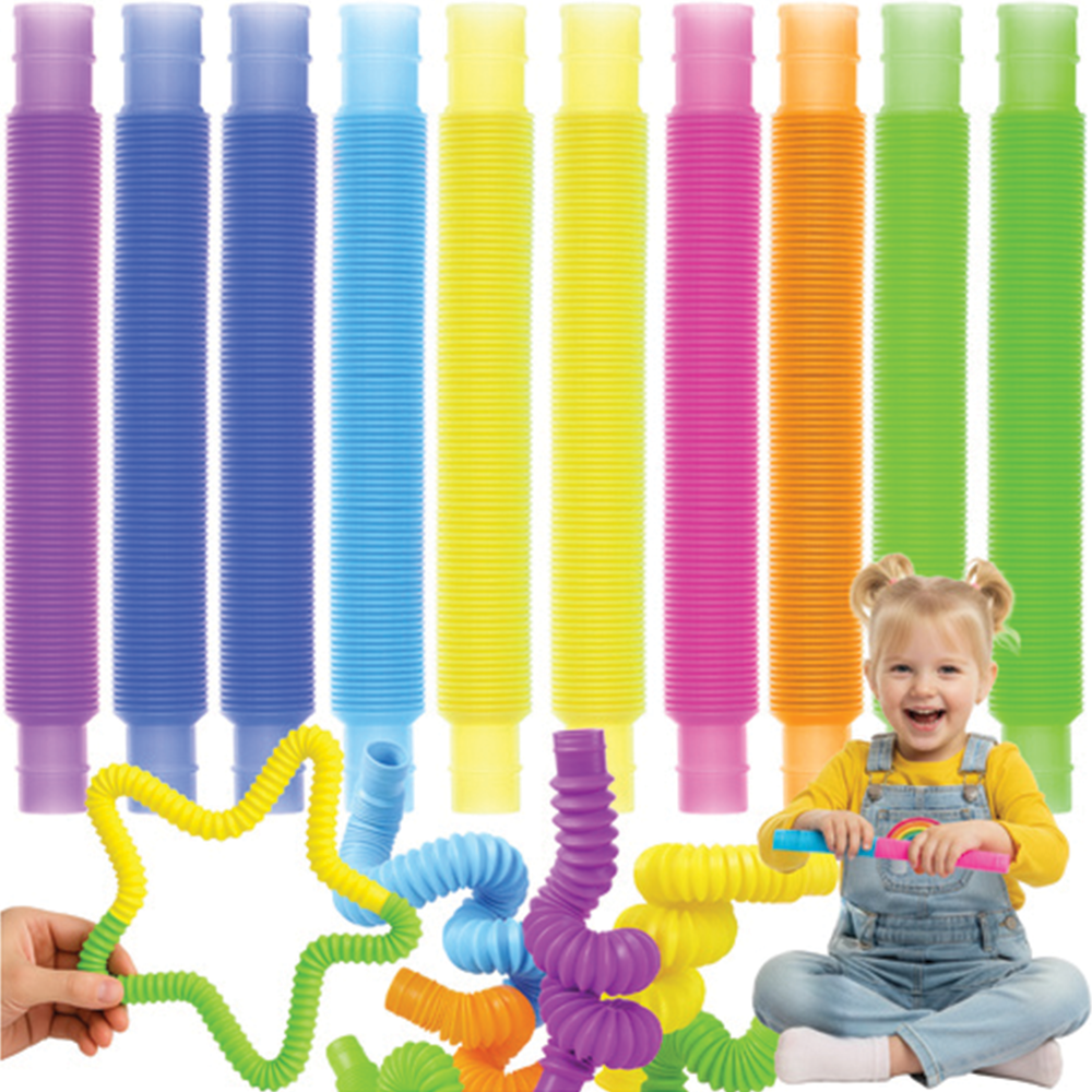 Sada senzorických trubic POP je ideální antistresová a vzdělávací hračka inspirovaná Montessori metodikou. Sada obsahuje 10 barevných roztažitelných trubic, které lze natahovat, ohýbat, spojovat a tvarovat do různých podob. Díky příjemnému zvuku při roztažení a pružné konstrukci pomáhá rozvíjet jemnou motoriku, koncentraci a kreativitu - a zároveň přináší zábavu i relaxaci pro děti i dospělé.