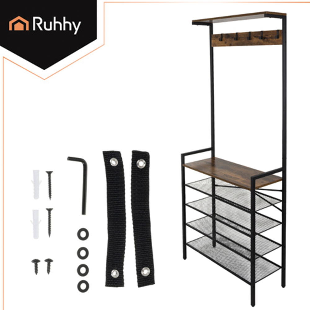Tento robustní kovový věšák s policemi je ideálním řešením pro přehledné uspořádání chodbových prostor, šaten či kanceláří. Spojuje elegantní industriální design s maximální funkčností – nabízí 4 vzdušné police na obuv, stabilní desku s nosností 15 kg a 5 dvojitých háčků na oděvy. Díky kompaktním rozměrům a možnosti ukotvení do zdi zajišťuje bezpečné a stylové zázemí pro vaše bundy, tašky i boty.